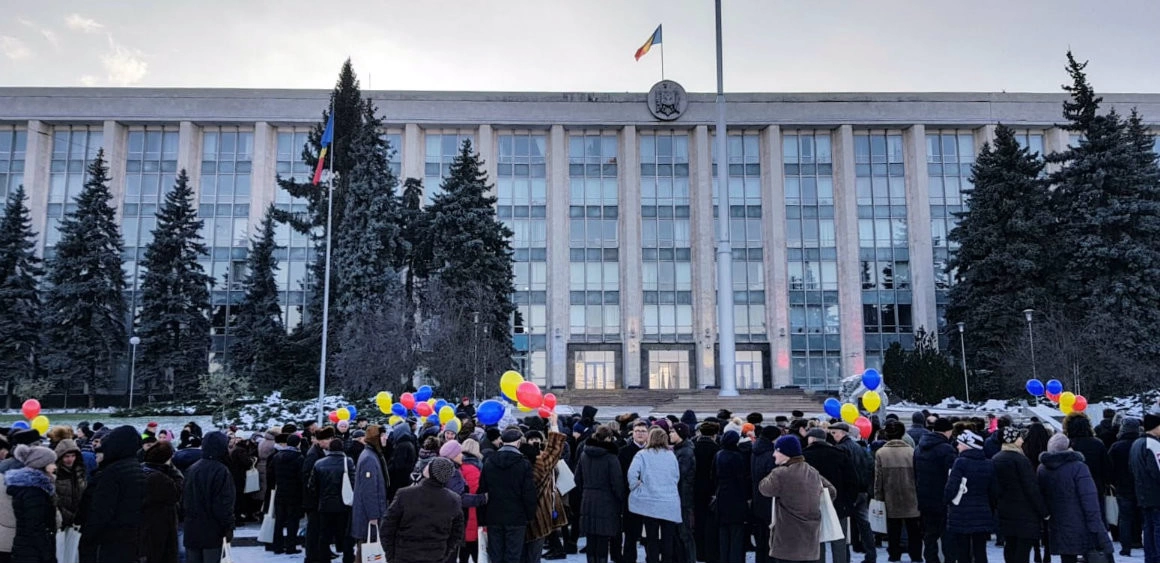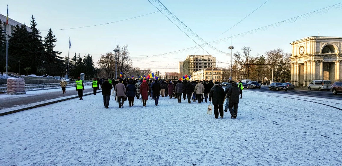 Ceva mai încolo, în aceeași piață, în dreptul arcului de Triumf și al unui banner mare, cu „Caravana de Crăciun”, se intersectează cu un grup mai numeros. Sunt circa 150 de oameni, din câte pot eu să număr, tocmai veniți de la întrunirea Partidului Liberal. Vlad Arion Nicolae (20 de ani), un moldovean blond în palton negru cu insignă tricoloră, constant înconjurat de colegii liberali care îi sorb vorbele, îmi spune că ar fi sperat și el să fie mai mulți oameni prezenți. Vremea geroasă, plus climatul politic destul de înghețat în anti-românism și el, mai ales de la alegerea socialistului Igor Dodon la președinția republicii, sunt unele dintre explicațiile posibile pentru prezența redusă. Îmi oferă discursul unionist cap-coadă, fără ezitări sau poticniri: el unul luptă pentru unire și s-a bucurat că la întrunirea liberalilor de dimineață au fost aproape 1000 de oameni. A ales să fie azi la Chișinău, mai aproape de „frații noștri”, decât să se ducă la Alba Iulia.