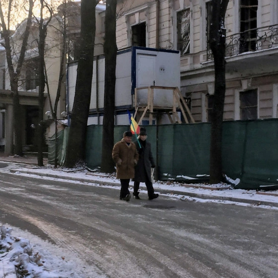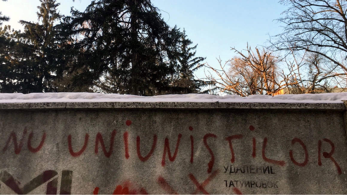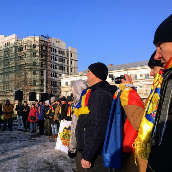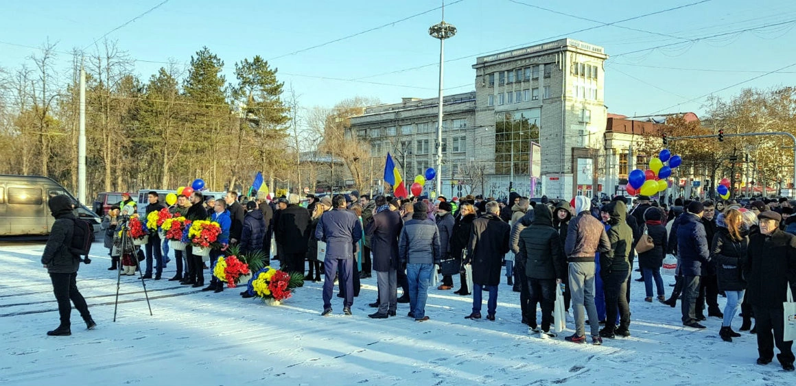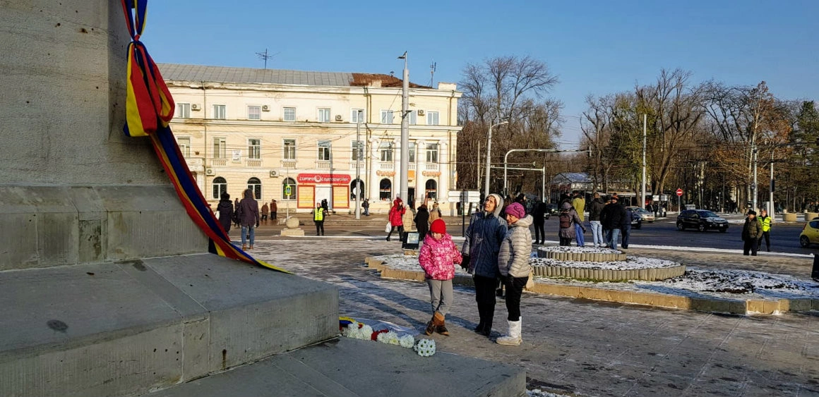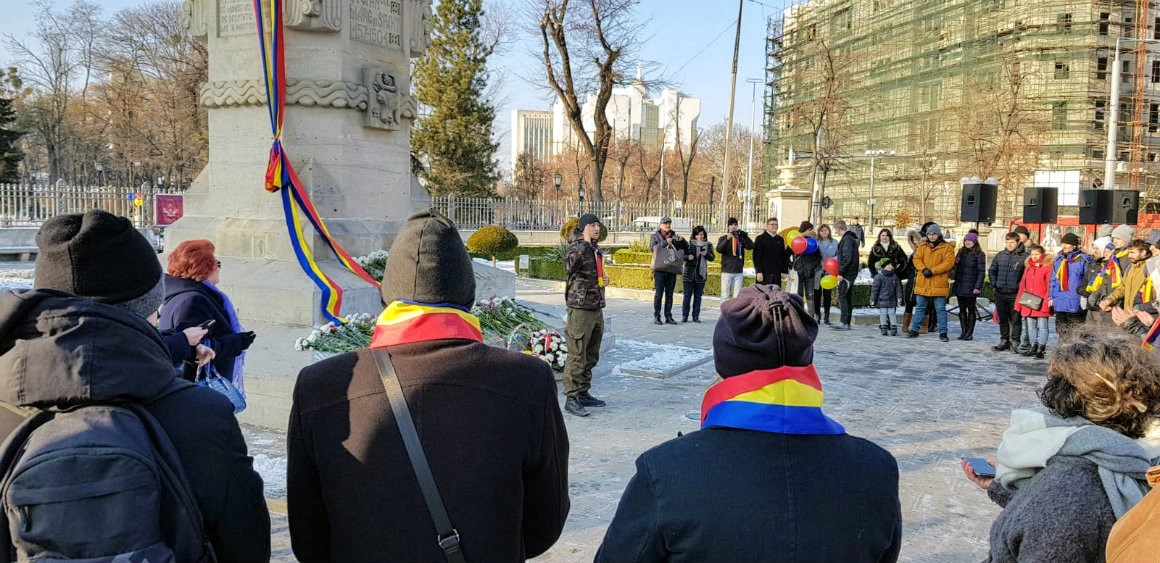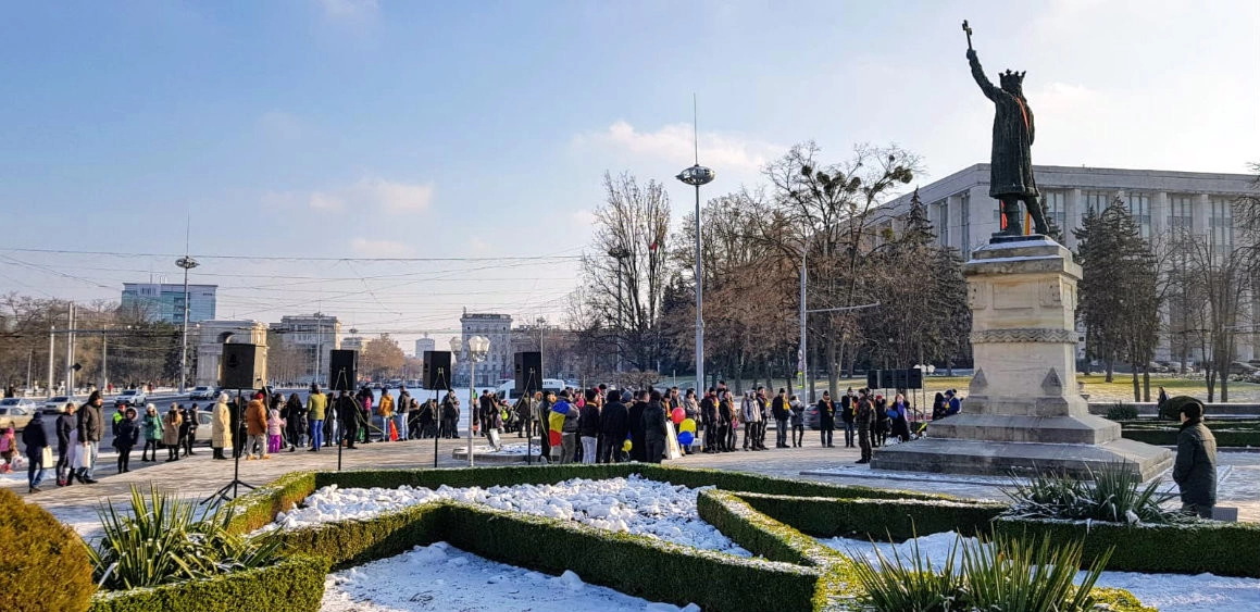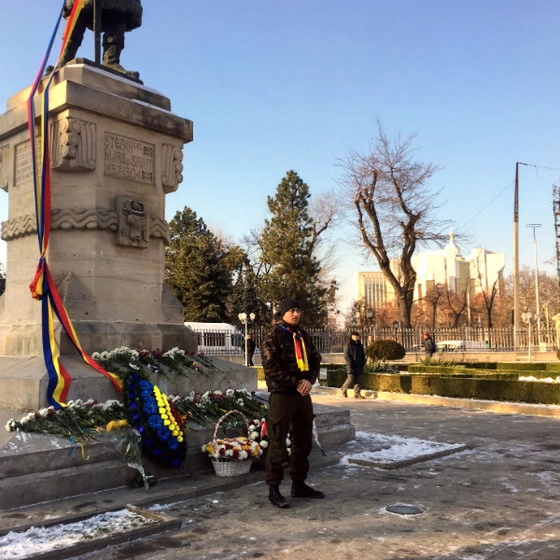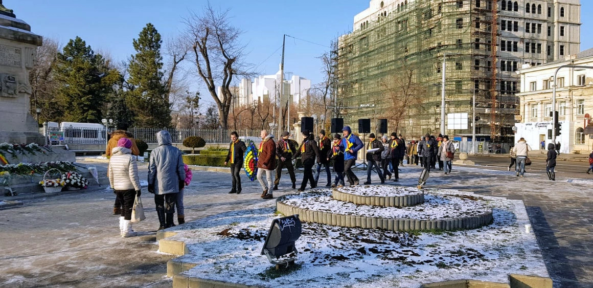 Câțiva copii și tineri fac selfie-uri, mai toată lumea tropăie pe ritmuri de Tu, Ardeal și Cântă cucu-n Bucovina, ca să se mai încălzească. Se mai animă atmosfera când, brusc, apare un grup condus de un tânăr îmbrăcat cazon. E Pavel Vintilă, vicepreședintele Noii Drepte din Republica Moldova. „Camarazii” poartă fulare tricolore la gât, iar unii sunt înfășurați în drapelul roșu, galben și albastru, varianta fără stema Moldovei. Se așează în semicerc în jurul statuii și scot bannerele cu „Reîntregirea României”.