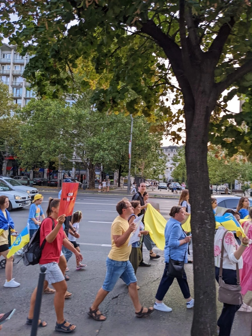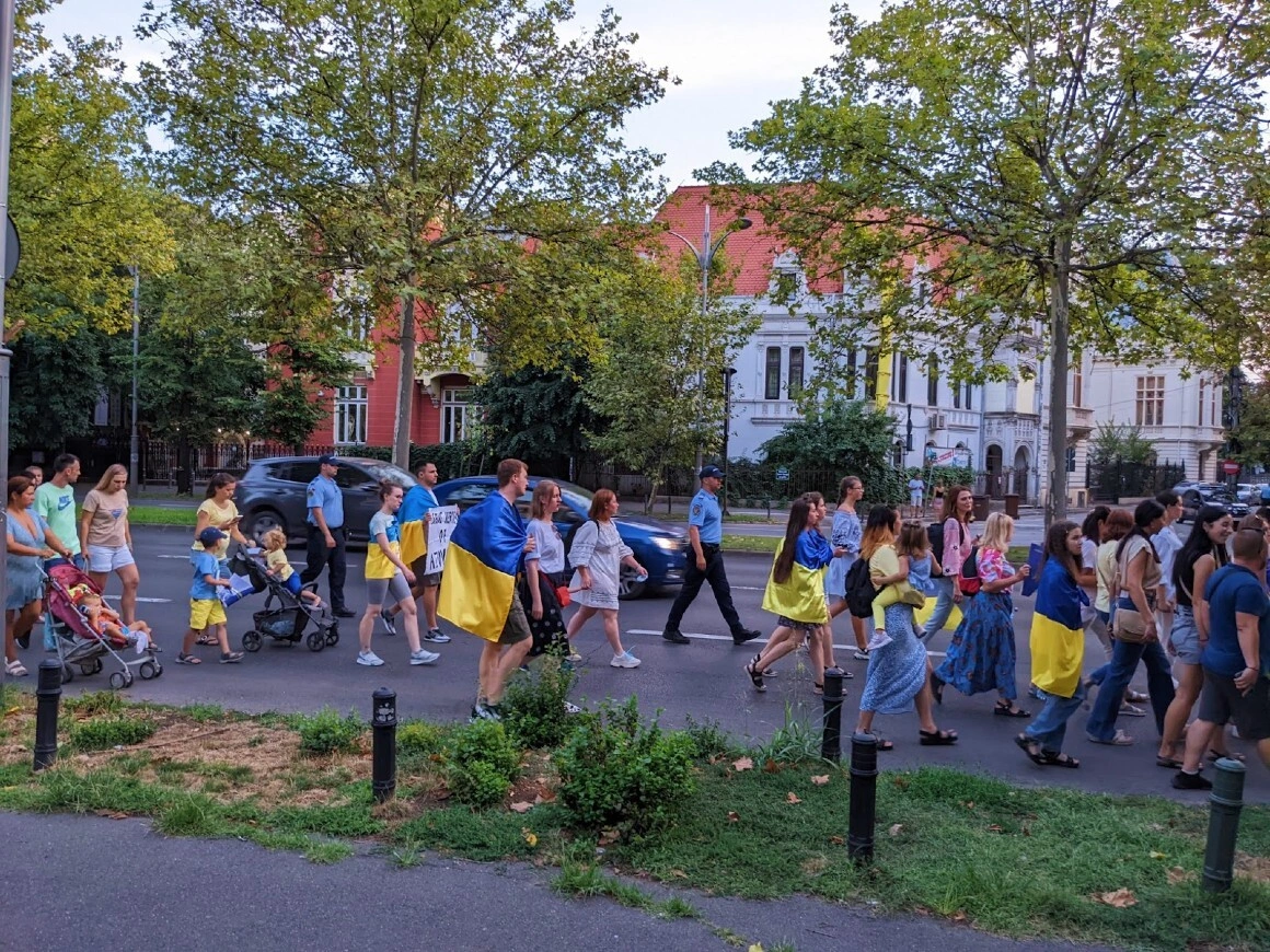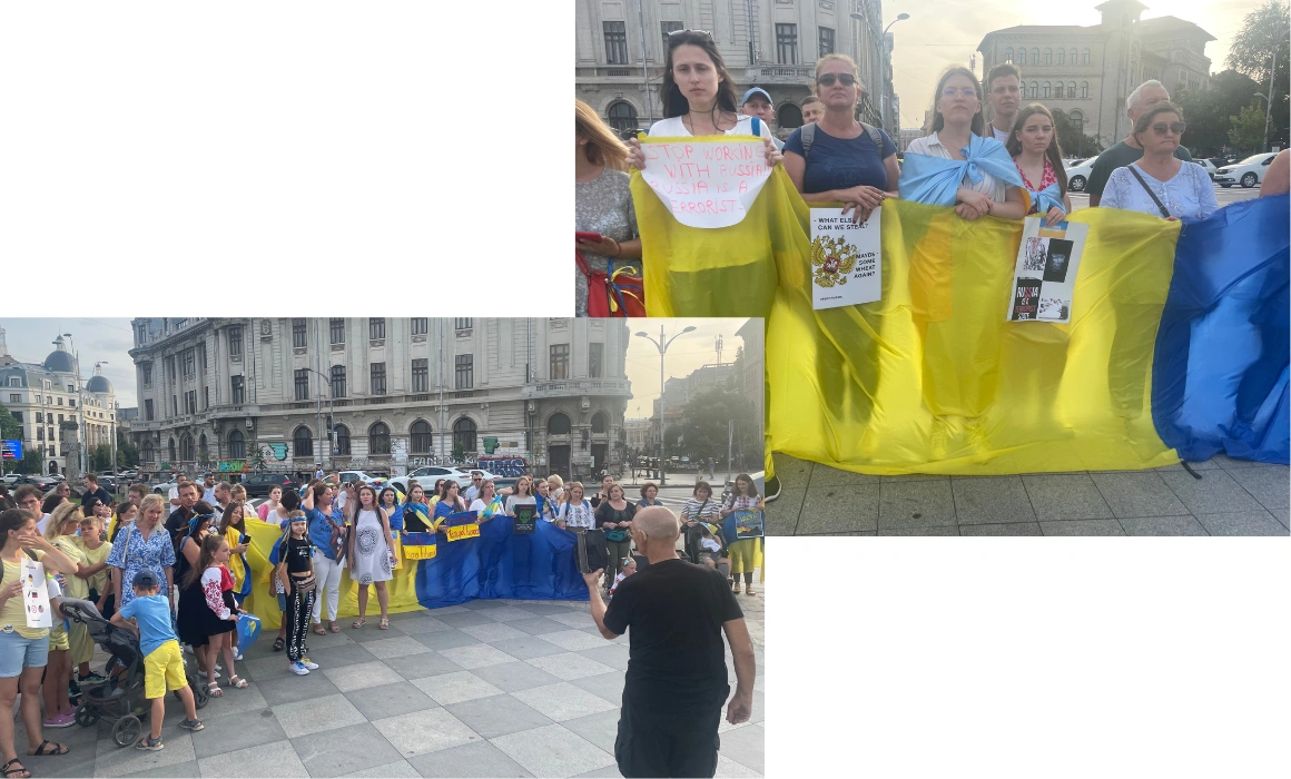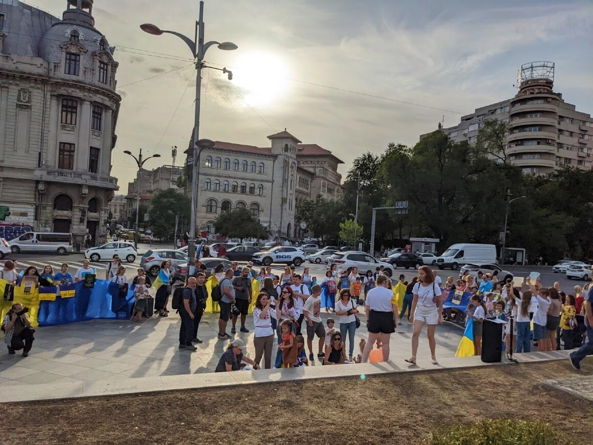 Am ales intenționat demonstrația din Piața Universității, pentru că o văzusem anunțată într-o postare de pe unul dintre grupurile de Facebook pentru refugiații ucraineni din România. M-a intrigat că evenimentul era co-organizat de Asociația „21 Decembrie 1989”. După cum mi-a explicat soția mea româncă, acesta e un grup politic cu state vechi, care își are rădăcinile în protestele studenților din timpul revoluției din 1989. Astăzi, are parte de un renume controversat, din cauza agendei sale conservator-naționaliste. Întâlnirea dintre organizatorii români extrem de politizați și ucrainenii care se adună cu ocazia Zilei Independenței, într-un moment în care independența Ucrainei este în pericol de moarte, promitea să ofere o perspectivă asupra autoreprezentării politice a migranților ucraineni. Sărbătorirea Zilei Independenței Ucrainei avea să se confrunte cu locul celei mai emblematice revoluții est-europene din 1989. Destinația marșului, ambasada Rusiei la București, promitea un punct culminant al evenimentului cu mare încărcătură emoțională.