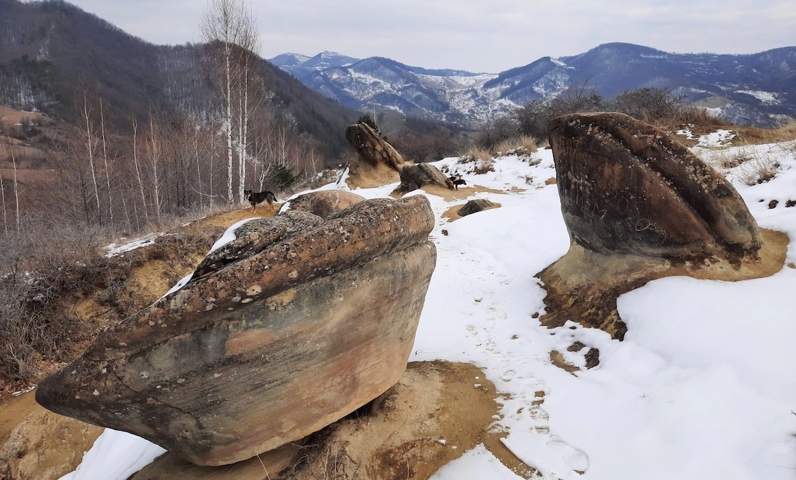 Dacă pleci dinspre București trebuie să mergi o vreme spre Ploiești, dar o să ieși repejor de pe autostradă, înainte să intri în aglomerația dinspre Valea Prahovei. Faci trei ore cu totul până în satul Nucu sau vreo două ore și jumătate până la Ulmet, locurile din care poți începe o călătorie de-o zi; sunt drumuri bune, apoi mai proaste, dar e musai să suferi nițel dacă vrei să-ți tragi sufletul la urmă într-un loc fabulos. Munții Buzăului înseamnă mult mai mult decât vulcanii noroioși: sunt trovanții de la Ulmet, coloși împrăștiați pe creste despre care o să afli că sunt „pietre vii”, modelate în continuu de vânt și „hrănite” cu nisip; sunt așezările rupestre împrăștiate prin pădurile din Țara Luanei, la care ajungi după ce lași mașina în parcarea din satul Nucu și o iei pe lângă gardurile din lemn ale gospodăriilor până în Poiana Cozanei. Traseele sunt bine semnalizate și poți alege variante mai lungi sau mai scurte, după chef și puteri (găsești o hartă aici). Dincolo de „atracțiile turistice”, îți recomand să te lași absorbit de peisaj, pur și simplu; o să-ți dai seama ușor de ce locurile astea — aflate cândva pe fundul unei mări — atrag generații de căutători de mistere și legende. (Vlad Odobescu)