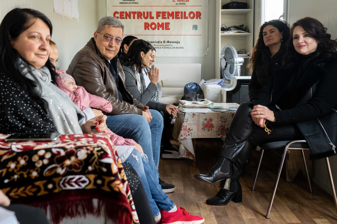 Dacă în București au rămas scaune goale la masa pentru discuții, la Mizil spațiul era prea mic pentru câți oameni erau prezenți. În containerul acoperit cu abțibilduri cu figuri istorice rome, precum activista și actrița Katerina Taikon sau poeta Papusza, calendare cu evenimentele importante pentru asociație (Ziua Femeii sau 8 aprilie, Ziua Internațională a Romilor) și post-it-uri pe care femeile au scris momente în care n-au avut încredere în ele, au stat Helena Dalli și traducătorul ei, femeile de la E-Romnja, femeile din Mizil și, înghesuit printre ele, primarul localității, Silviu Negraru.