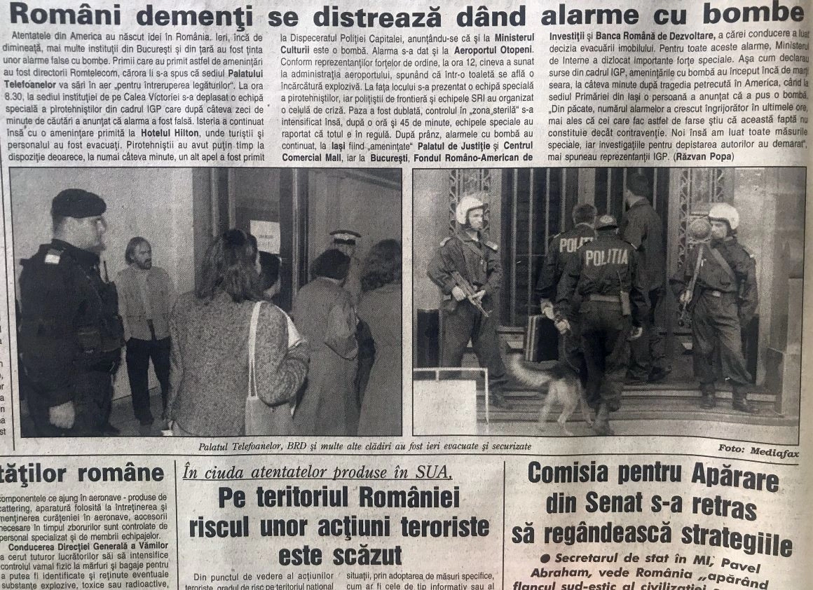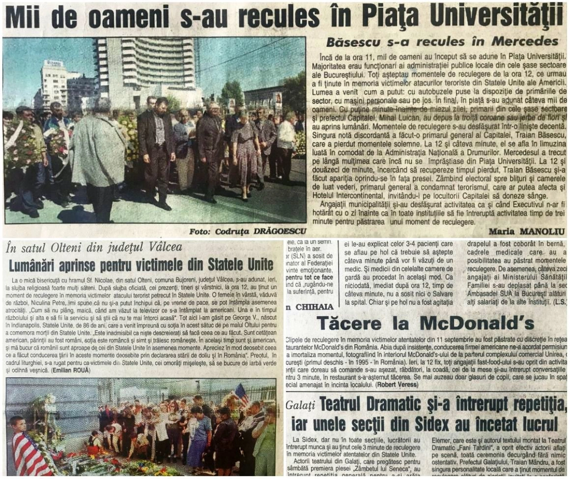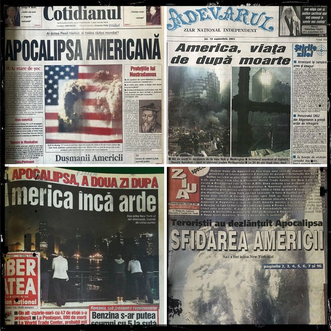 Însă avioanele prăbușite de teroriști peste clădirile World Trade Center și peste Pentagon au schimbat cursul obișnuit al unei zile românești de tranziție. Publicațiile din zilele următoare aveau să redea, pe lângă fotografiile cu oameni plini de praf și sânge din inima Americii, și felurile în care unda de șoc s-a propagat peste România. Clădirile în care funcționau Coca-Cola și alte companii americane erau păzite cu strășnicie, la McDonald’s se țineau momente de reculegere, hoții se potoleau de teama atentatelor. Nici bâlciurile nu mai erau la fel. Ne-am uitat în câteva dintre marile cotidiene ale vremii, să vedem cum au prezentat atmosfera zilelor post-tragedie.