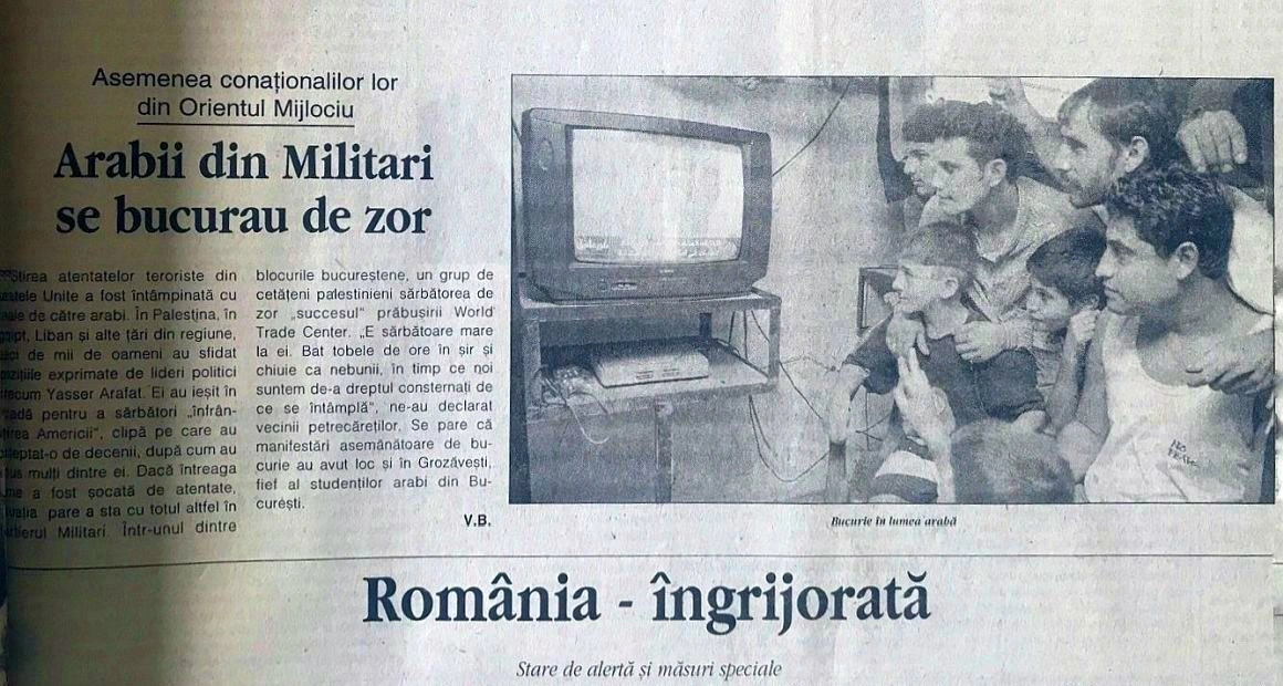 În timp ce piețele de capital din Europa erau în colaps, iar pe Bush îl păzeau 50 de avioane, potrivit „Cotidianul”, jurnaliștii de la aceeași publicație scriau că „un grup de cetățeni palestinieni sărbătorea de zor ‘succesul’ prăbușirii World Trade Center” în cartierul bucureștean Militari. Știrea era însoțită de o fotografie în care câțiva tineri presupuși arabi se uitau, captivați, la ecranul unui televizor pe care se distingeau doar niște cuvinte arabe. „E sărbătoare mare la ei. Bat tobele de ore în șir și chiuie ca nebunii, în timp ce noi suntem de-a dreptul consternați de ce se întâmplă, ne-au declarat vecinii petrecăreților. Se pare că manifestări asemănătoare de bucurie au avut loc și în Grozăvești, fief al studenților arabi din București.”