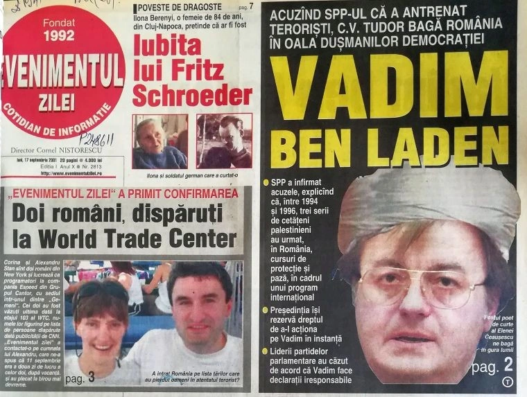 Curând, avea să iasă la rampă liderul Partidului România Mare, Corneliu Vadim Tudor. Acesta acuza SPP că a antrenat teroriști. EVZ scria că, prin astfel de afirmații, CV Tudor băga România în oala dușmanilor democrației și-l înfățișa cititorilor drept „Vadim Ben Laden”. Asta în timp ce poveștile cu români care scăpaseră de moarte ca prin urechile acului continuau să curgă: Cristinel Zlotea, de exemplu, angajat într-un birou din World Trade Center, fusese salvat de un guturai.