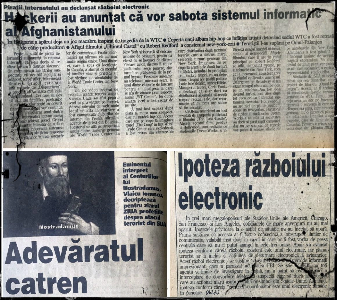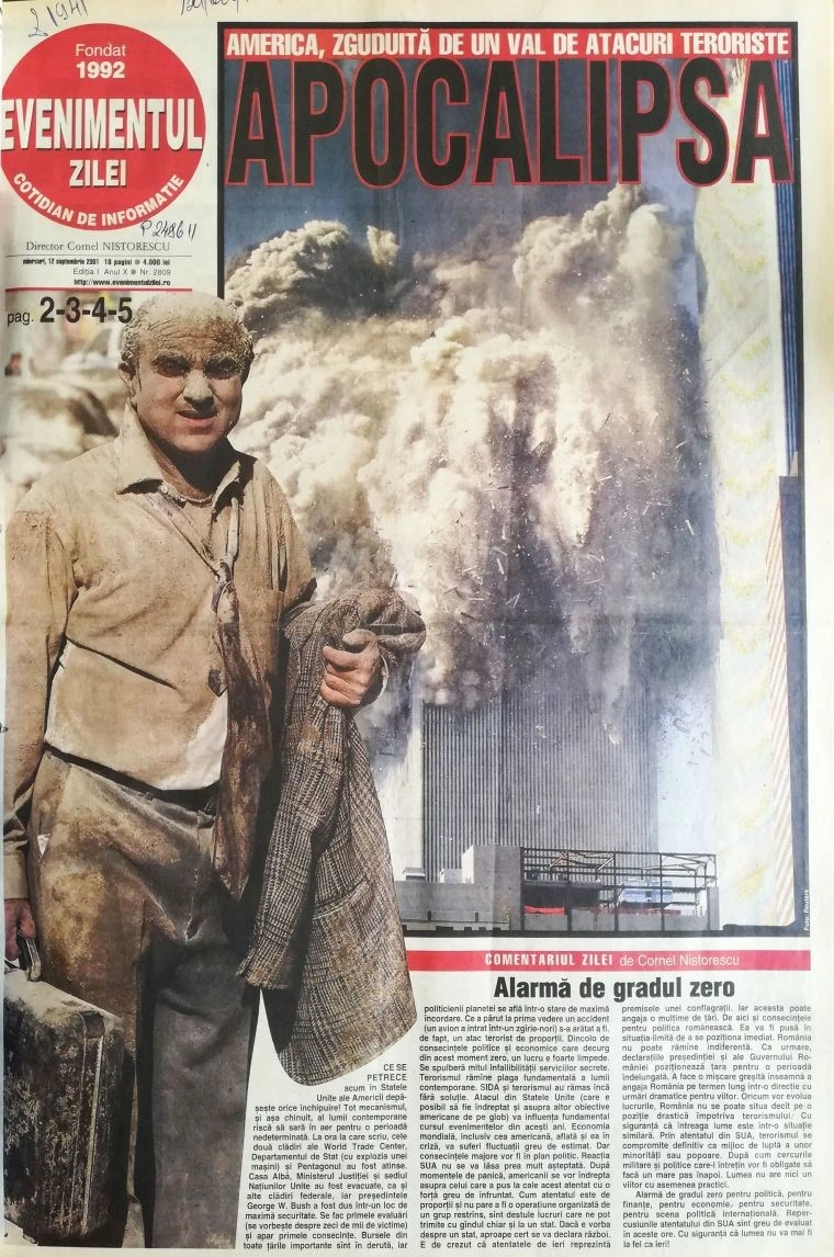 În rest, pe fundalul tragediei newyorkeze, în paginile ziarului vuiau viața și moartea din România: „Un tânăr adormit în stradă, călcat de mașini”, „Pensionara milionară”, „Contrabandă cu papuci de zece miliarde de lei”, „Fraudă de 132 de miliarde de lei din afaceri cu ulei” etc. Plus o premieră națională: „prima librărie electronică din România” - www.e-librarie.ro.