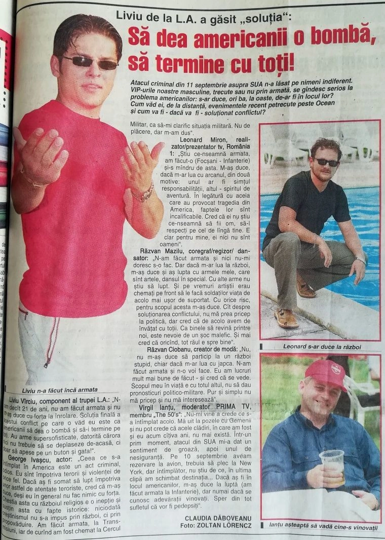 La pagina „Cocktail”, vedetele masculine autohtone au fost întrebate dacă ar merge la război împotriva terorismului. Cap de listă era Liviu Vârciu, pe-atunci component al trupei L.A. Acesta nu făcuse armata, dar nici nu vedea c-ar fi nevoie de el: „Soluția finală a acestui conflict pe care o văd eu este ca americanii să dea o bombă și să-i termine pe toți. Au arme supersofisticate, datorită cărora nici nu trebuie să se deplaseze de-acasă, ci doar să apese pe-un buton și gata!”.