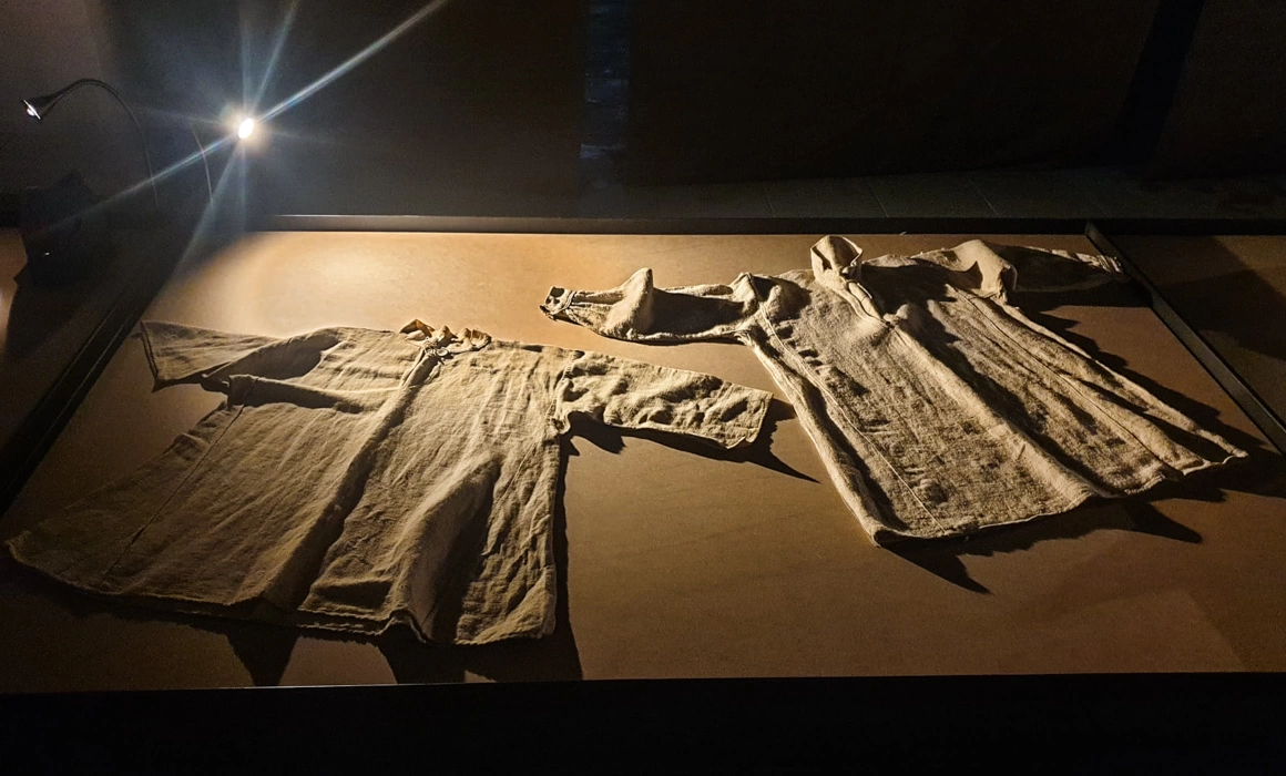 Într-un capăt al sălii de expoziție ii țărănești albe sunt întinse pe jos, lângă uniforme kaki sau albastre de soldat. Lui Goagea, arhitectul care s-a ocupat de designul expoziției, și echipei lui le-a venit ideea să le expună așa când le-au văzut așezate în depozit, cu brațele deschise, ca un mort întins pe pământ.