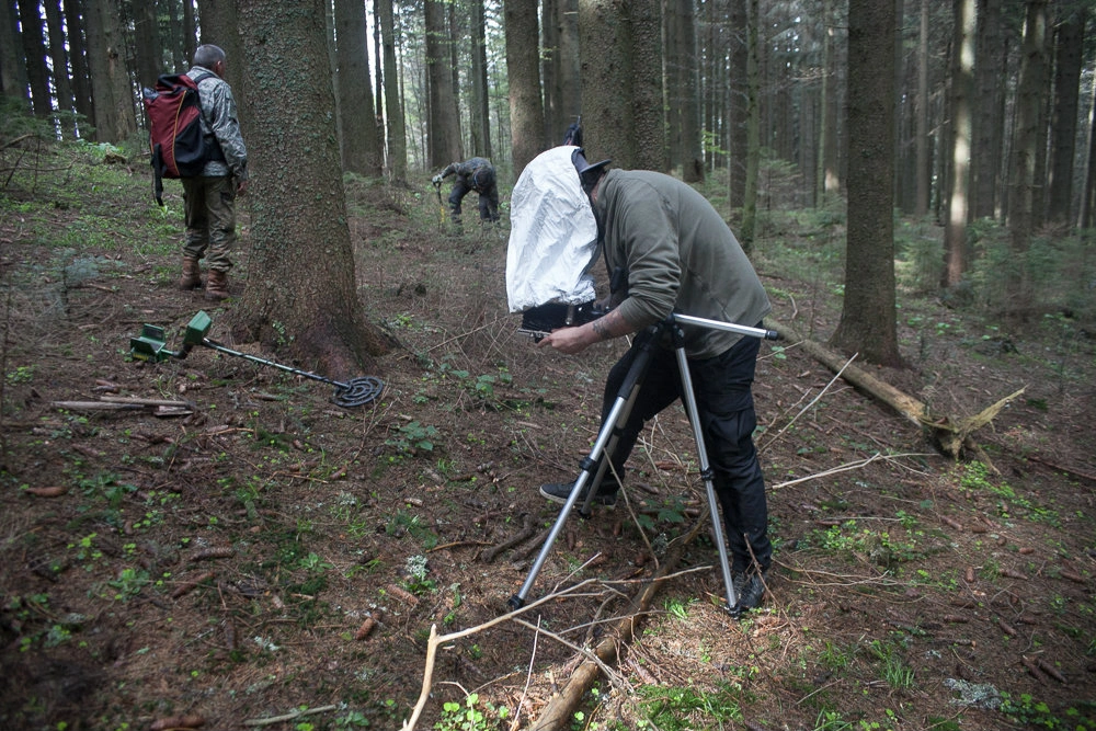 Am urcat prin niște râpe, cu ghiozdanele în spate, trepiezi și detectorul după noi, iar la un moment dat, pe o pantă abruptă, am alunecat și m-am agățat într-o lopată, de care trăgea Bogdan ca să mă ajute să urc. Am ajuns pe un deal, in the middle of nowhere. I-am zis lui Gîrbovan „Tu-ți dai seama unde suntem noi acum?” Pe lângă faptul că eram într-o pădure din Neamț, ne aflam într-un loc așa de remote, fără nicio legătură cu nimic - cine să fi trecut vreodată pe-aici? Ne-am oprit un pic și Bogdan a început să dea cu detectorul. Chiar acolo, pe vârful ăla de deal, au început să iasă din pământ decorații românești, gloanțe, obuze. (M. Bressan)