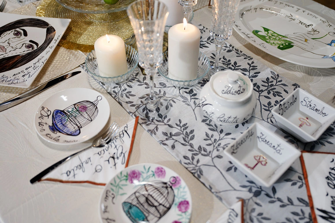 După vreun an și jumătate, mă hotărăsc să expun porțelanul pictat și ars în cadrul unei instalații - Cuvinte sparte. O împărtășesc publicului în expoziția mea Locuri uitate ale inimii mele, curatoriată de Nona Șerbănescu, la ARTHUB, singura galerie unde aș avea curajul să o expun. Acolo mă simt în siguranță. Recreez cu ajutorul porțelanului o masă de familie, cu toate obiectele așezate cochet, între pahare de cristal, șervete, tacâmuri de argint. Masa de familie, de sărbătoare, locul în care ar trebui să ne simțim cei mai protejați și cei mai fericiți, se transformă deseori în loc de coșmar din cauza abuzurilor ce se petrec în spatele pereților.