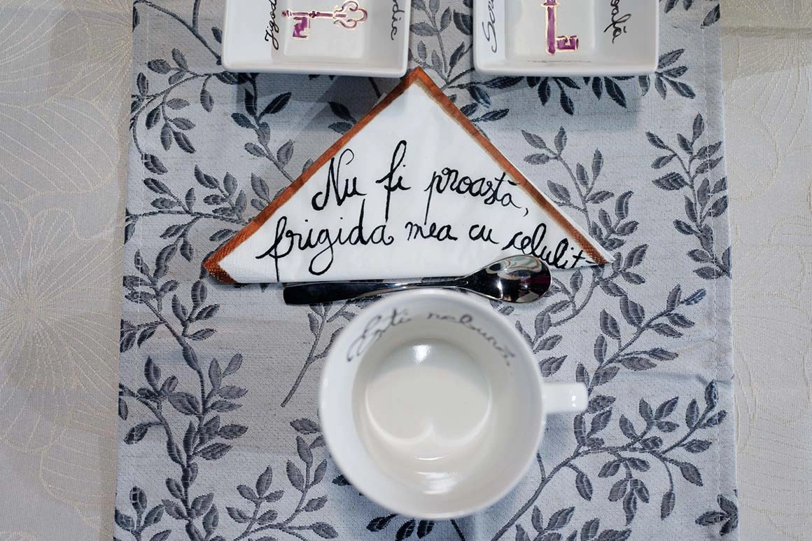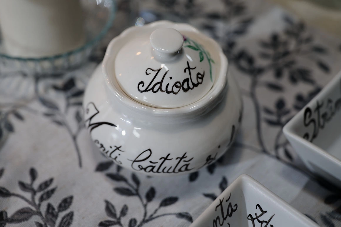 După ce încep să mă dezvăț de frică, în inima mea încolțește o idee. O să iau o parte din expresiile oribile pe care mi le-a adresat fostul meu partener și o să le pun pe porțelan. O să fac o colecție de o frumusețe schizoidă. Bag la cuptor prima cană cu farfurie. Încep să mă gândesc că poate ar trebui să adun mesaje de la mai multe femei care au trecut prin aceleași experiențe. Încet, încet, adun mesaje de la peste 50 de femei. Cuvintele sunt foarte greu de dus. Un obiect care în mod normal îmi ia o zi să-l pictez, îmi ia acum săptămâni. Aleg doar o parte dintre expresii, pentru că multe se repetă.