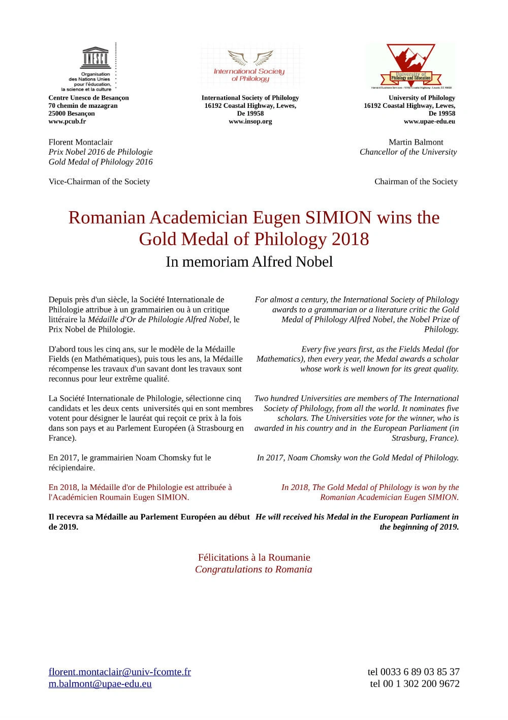 „Academicianul Eugen Simion și Academia Română au primit în data de 17 decembrie 2018 o scrisoare de înștiințare prin care International Society of Philology anunța conferirea Medaliei de Aur pentru Filologie Alfred Nobel academicianului Eugen Simion. Ca urmare a anchetei de presă realizată de patru jurnaliști români, aflăm cu îngrijorare că existența reală a premiului și a instituției emitente este pusă sub semnul întrebării.
