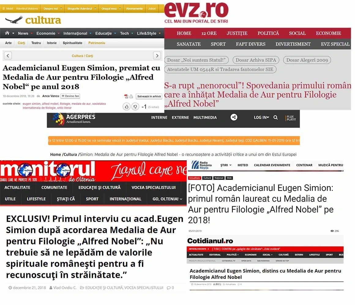 În decembrie 2018, Eugen Simion, director al Institutului de Istorie şi Teorie Literară „G. Călinescu“ al Academiei Române și fost președinte al Academiei pentru aproape un deceniu, a fost înștiințat că a câștigat „Medalia de Aur pentru Filologie Alfred Nobel, Premiul Nobel pentru Filologie”. Eugen Simion (85 de ani) este autorul a numeroase volume și articole de critică literară și coordonatorul unor proiecte editoriale importante ale Academiei Române, printre care „Dicționarul general al literaturii române”, facsimilarea integrală a manuscriselor lui Mihai Eminescu și colecția de tip Pléiade „Opere fundamentale“, din care au apărut aproape 250 de volume.