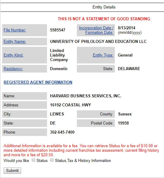 Intriga merge, însă, mai departe, fiindcă în spatele Societății Internaționale de Filologie se află o altă entitate fictivă: University of Philology and Education din Lewes, Delaware, un orășel cu puțin peste 2.000 de locuitori. La adresa indicată pe site-ul universității se află, de fapt, sediul DelawareInc, compania care, conform propriului site, e administrată de Harvard Business Services Inc (HBS), o firmă care te ajută să-ți faci firme în Delaware. De ce tocmai în acest stat de pe coasta de est a Statelor Unite? Pentru că e un fel de Cipru american, un paradis fiscal în care oricine poate deține anonim o afacere. Chiar și persoane din afara SUA, după cum ni se explică pe blogul DelawareInc.