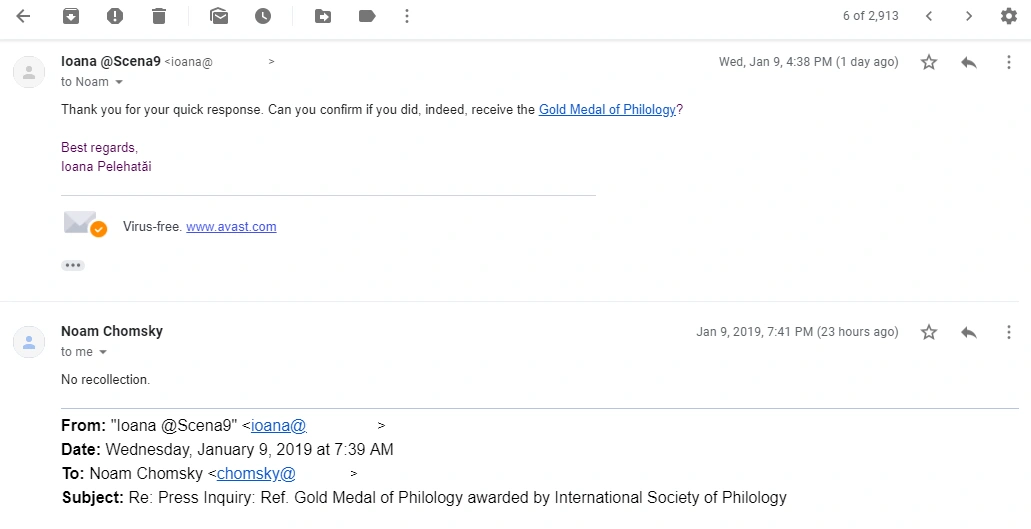 Întrebat explicit dacă a primit sau nu Medalia de Aur din partea Societăți, Noam Chomsky nu-și amintește să fi primit vreodată „Nobelul pentru Filologie”: