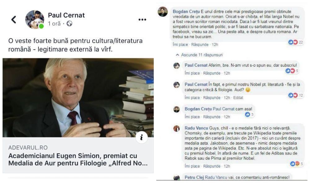 România a primit vestea cu bucurie și ușurare: în sfârșit, un român premiat cu „Nobel”! Comunicatul trimis de Academia Română a fost preluat fără nicio verificare de către mare parte a presei și de către unii critici și istorici literari. Potrivit comunicatului, „ideea creării unui premiu special pentru critici sau cercetători în analiza gramaticii sau literaturii s-a născut odată cu acordarea, în 1927, a Premiului Nobel pentru Literatură filozofului francez Henri Bergson, care nu era nici poet, nici romancier. Astfel, s-a decis ca la fiecare cinci ani, Societatea Internațională de Filologie să acorde, după modelul Medaliei Fields pentru Matematică, o medalie de aur a filologiei în memoria lui Alfred Nobel.”