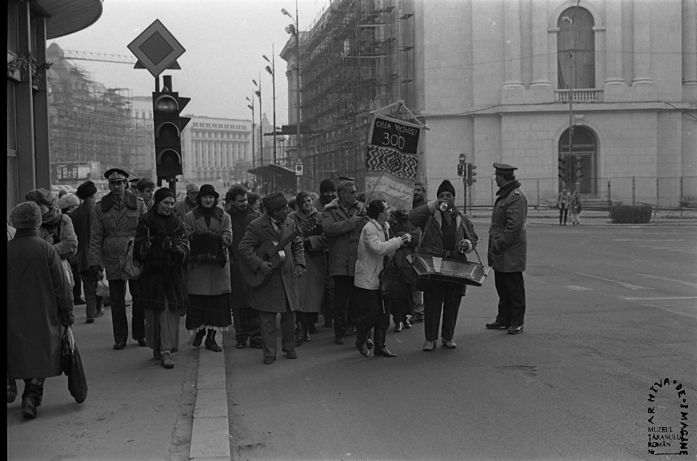 Prima oară am ieșit în stradă cu Foaia de Crăciun. Asta a fost într-adevăr cu totul neașteptat, pentru că am ieșit cu o căruță, cu un cal amărât adus din apropiere, cu niște colindători excepționali din Slobozia, descoperiți de etnomuzicologii noștri, de Speranța Rădulescu în primul rând. Cântau cu totul altfel decât te-ai aștepta să fie cântate colindele: gros, ca un regiment de bătrâni. Melodia era ritmată lent, trâgând de buhai și bătând din tobe. Pentru bucureștean, asta nu însemna colind. Un coleg de-al nostru, Gabriel Hanganu avea căruța plină de aceste foi lucrate tot de noi manual, făcute sul și legate cu sforicele, pe care le împărțeam lumii pe stradă. În spate erau acești bărbați care cântau relativ trist și băteau din tobe, după care venea alaiul nostru, cei ai muzeului, care eram oarecum stânjeniți pentru că ieșeam prima oară în stradă și umblam așa, destul de strânși unii în alții, în spatele căruței. Lumea care trecea era convinsă că e o înmormântare: mașinile claxonau, aprindeau farurile și noi mergeam cu „înmormântarea” noastră tot înainte. Pe urmă, când ne-am dat seama, am început să ne amuzăm, să râdem, și lucrurile s-au schimbat puțin.
