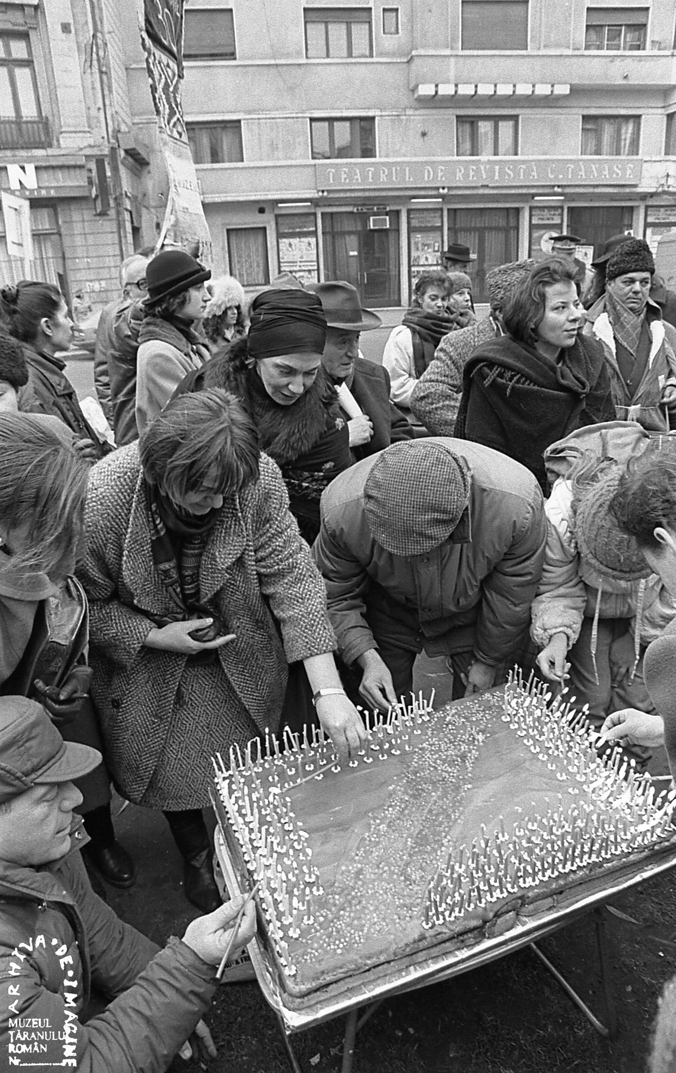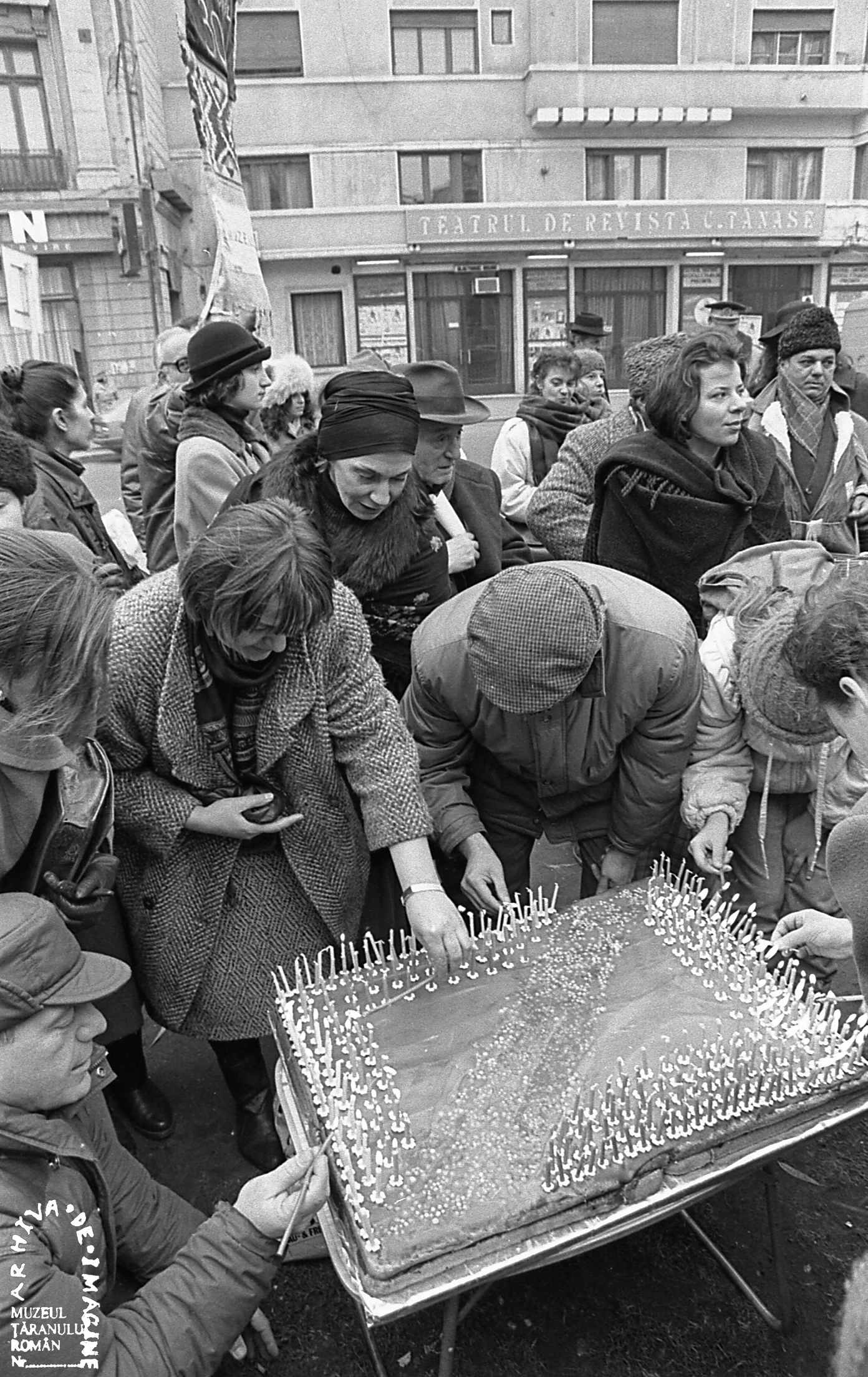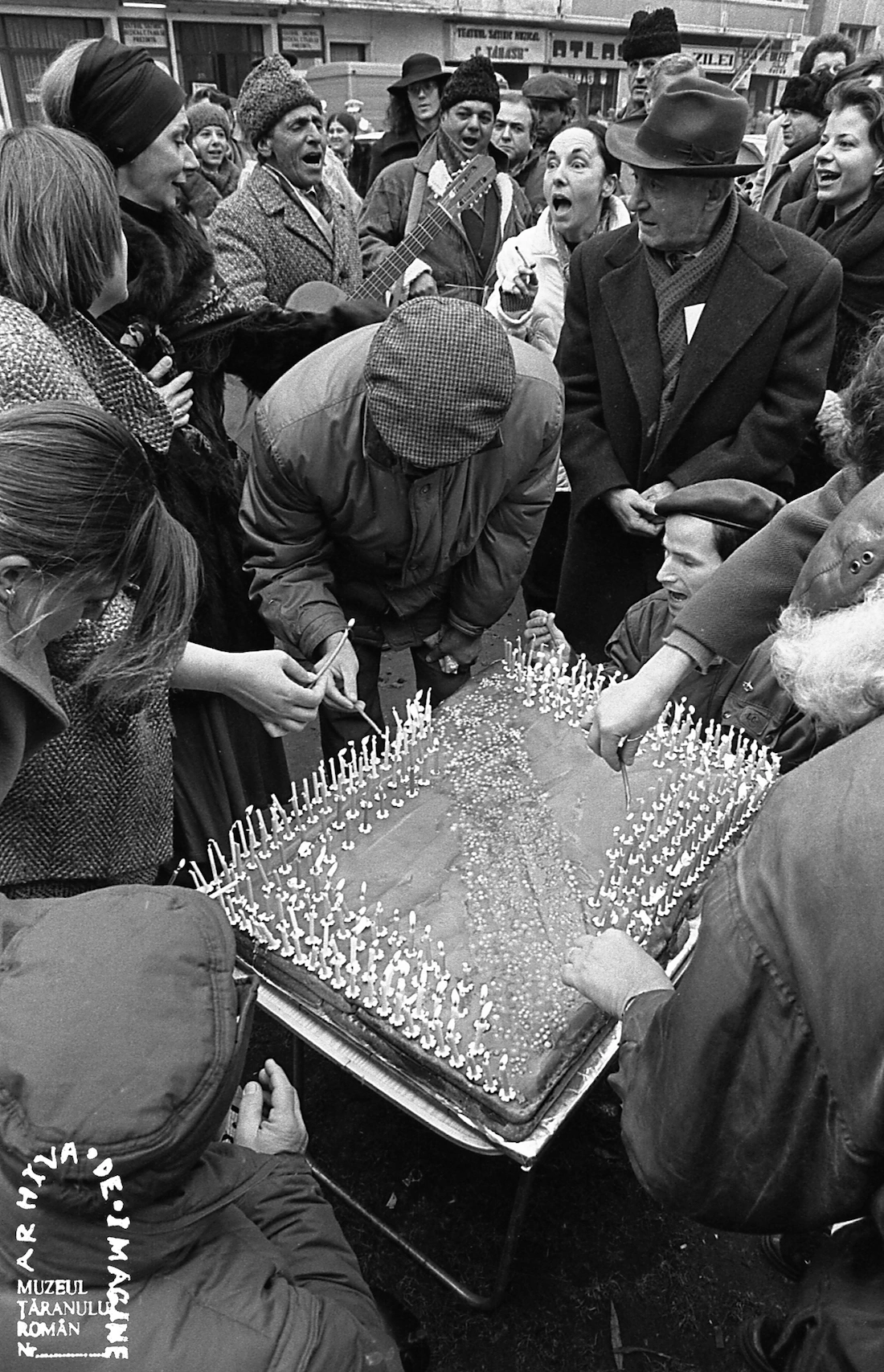 Tot ideea Irinei a fost. Și am zis: „Unde o să găsim un tort cu 300 de lumânări?” Zice: „Dar de ziua ta nu faci tortulețe?” „Păi tortulețe, dar ăsta trebuie să fie ceva enorm!”. „Faci unul mare…” „Dar nu-mi încape în cuptor, e un cuptor de aragaz. Și pe ce-l punem? Cum îl ducem?" „Nu știu, descurcă-te, fă-l din bucăți. Îl punem pe-o planșetă”. Într-adevăr, l-am făcut din bucăți într-o noapte, l-am pus pe o planșetă și a fost transportat așa, cu 300 de lumânări. Era surprinzător pentru lumea de pe stradă. Că mergeam în alai și cântau lăutarii, asta încă mai mergea. Dar aveam un tort imens cu lumânări, opream lumea pe stradă și le ofeream câte-o bucățică de tort. Și atunci voiau să afle de ce, pe cine sărbătorim. Asta într-adevăr a mișcat puțin oarecarele dezinteres al trecătorului, l-a făcut dintr-odată să deschidă ochii și să participe. Era ceva nou.