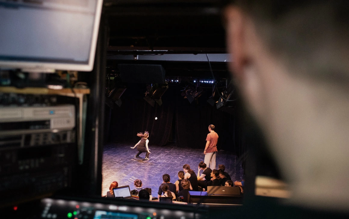 Am vrut să vedem ce presupune, mai exact, o probă de aptitudini fizice, ca să avem o imagine mai clară a procesului de pregătire a unui actor în devenire. Am primit permisiunea să asistăm la o parte din sesiunea de examinare, așa că am intrat în sala cu pereții acoperiți de cortine negre.