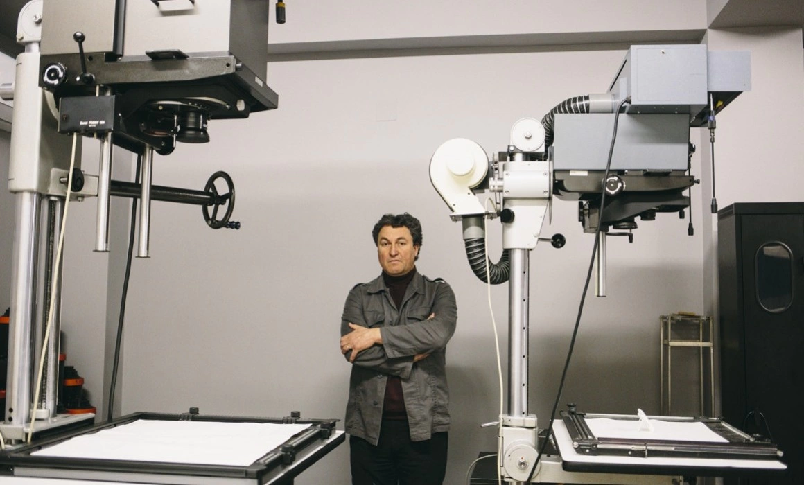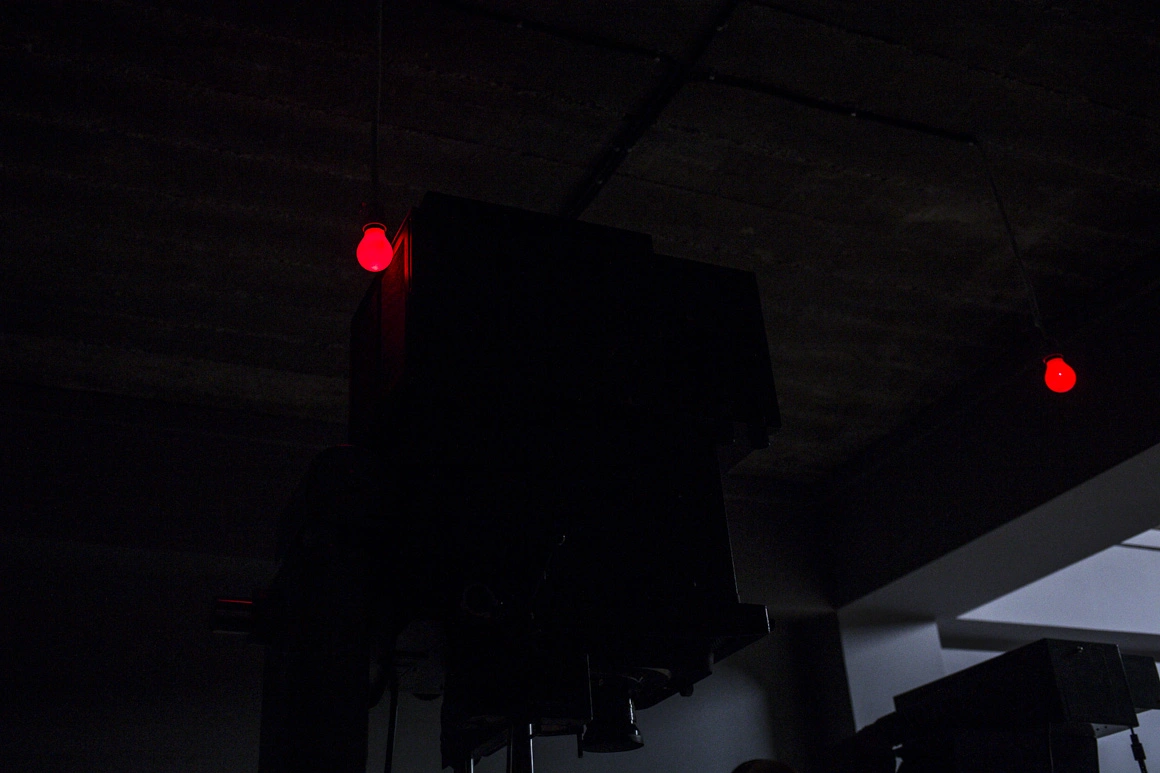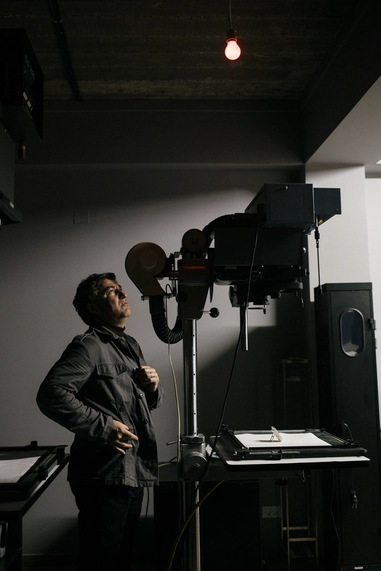 Intrăm în laborator, acolo unde se desfășoară tot fluxul de producție și unde se află sistemul de baie termostată (folosit pentru developare), frigiderul în care sunt depozitate filmele, cutiile cu revelatori speciali și, într-un capăt, așezați pe șine, sunt „cei doi elefanți”, cum îi numește Matei, aparate fotomăritoare Durst, înalte de peste doi metri, produse în anii 80 și folosite pentru clișeele mari.