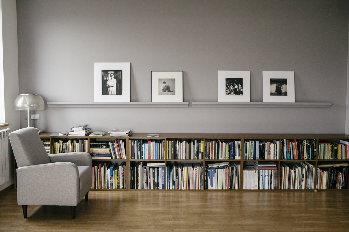 Dintr-un coridor îngust pătrundem într-un living spațios și luminos, dominat de tonuri albe și gri. De jur-împrejur văd cărți, fotografii înrămate și rafturi cu CD-uri, discuri și benzi de magnetofon. O scară fără balustradă duce la etaj, acolo unde se află „colțul de citit” - un fotoliu așezat lângă un raft cu albume de fotografie și de artă. E un decor minimalist, primitor și confortabil, și care îmi solicită privirea, de parcă plimb printr-o galerie de artă.