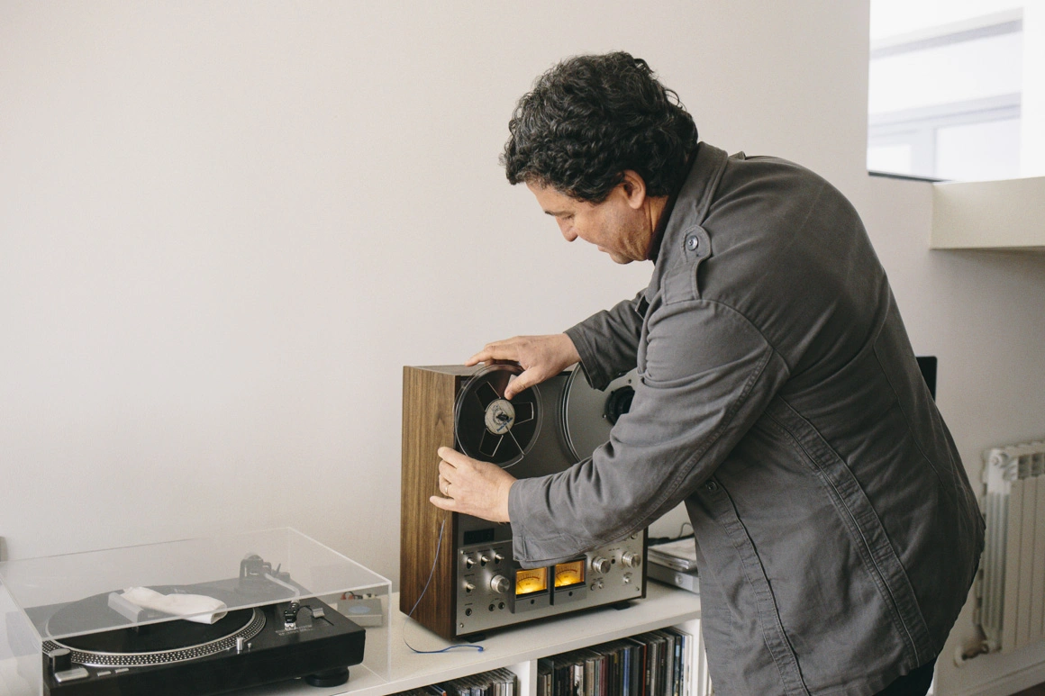 Matei se sprijină cu o mână de magnetofon și închide ochii pentru câteva secunde. E din nou în lumea lui, el și muzica.