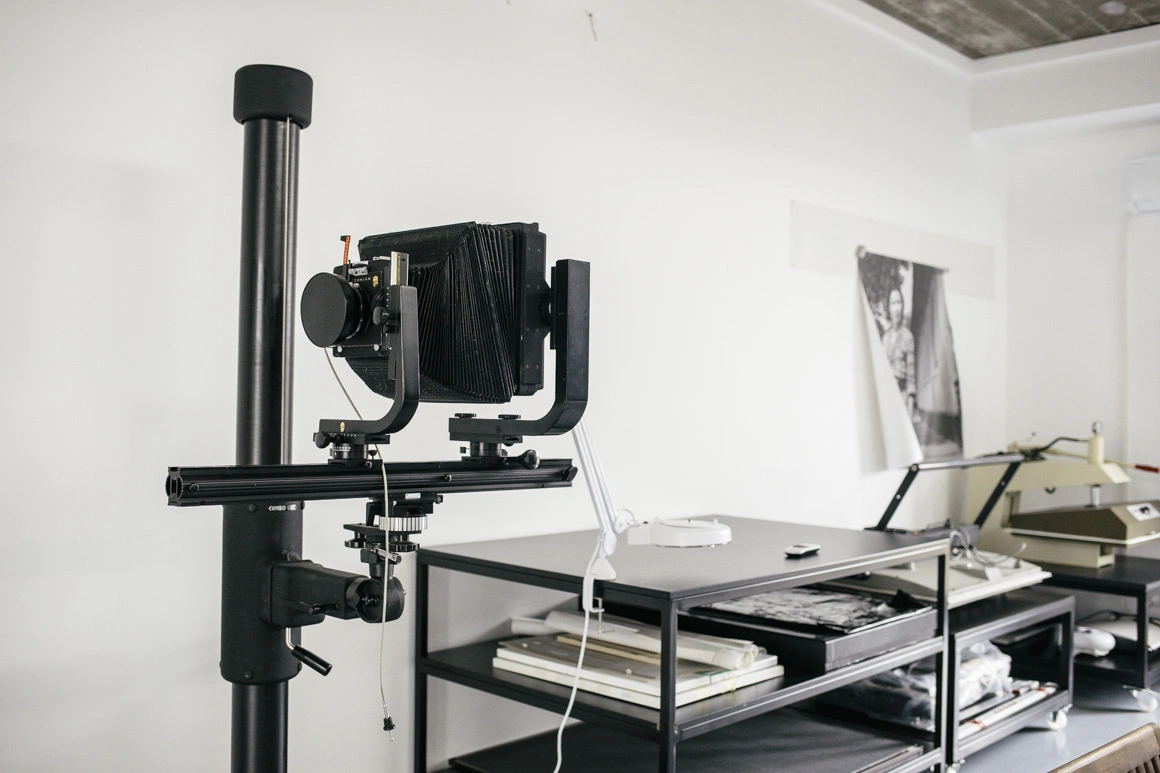 Studioul e o încăpere cu un aer industrial, accentuat și de tavanul de beton care pare neterminat. „Aici îmi petrec eu cel mai mult timp”, spune el zâmbind și începe să ne prezinte materialele sale de lucru: kiturile cu echipamente foto, presele mecanice (care au peste 200 de kg fiecare și pe care le folosește la printurile din hârtie pe bază de bumbac), o pompă cu ulei, un scanner folosit pentru negative („scanări de imagini care să arate ca fotografii-tablou, asta mă interesează pe mine”), aparatul de studio și diapozitivele, puse toate în cutii speciale. Totul e ordonat și arhivat, iar spațiul e gândit astfel încât să fluidizeze procesul de muncă. Spre exemplu, gențile cu kiturile foto sunt așezate pe niște rafturi, chiar lângă ușa care dă în garaj, ca să-i fie la îndemână atunci când pleacă pe teren.
