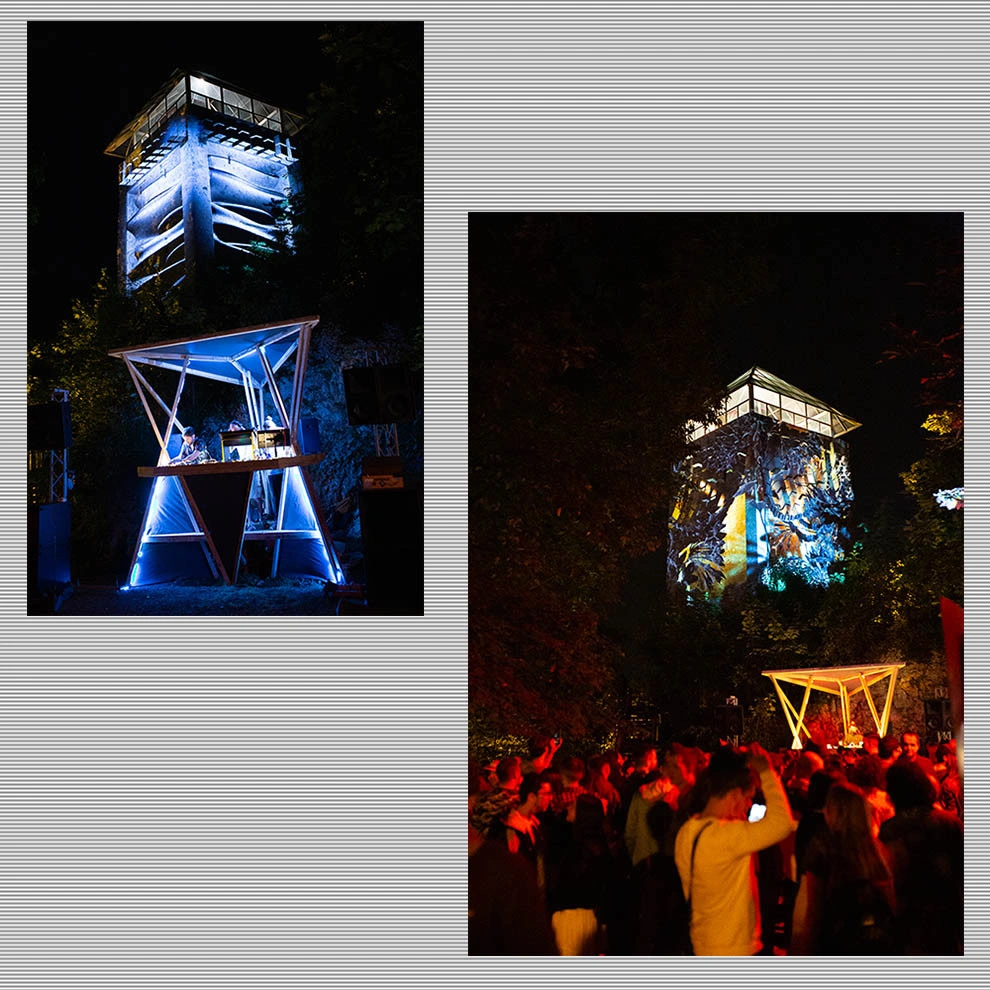 De pe deal, te ocrotește Turnul Negru, construit în secolul al XV-lea, despre care se spune că a fost lovit de trăsnet și înnegrit. La Amural, ține în gazdă o expoziție și e suportul unor proiecții de lumini. Turnul Alb, un pic mai sus și mai izolat, e transformat în White Elevator, unde instalațiile celor de la RIZI, ale masteranzilor de la CINETic din București și Universitatea Babeș-Bolyai din Cluj, dar și ale unor artiști independenți, precum D.A.I. (Dan Adrian Ionescu), împletesc arta cu tehnologia. În partea cealaltă a orașului, la final de seară, te-așteaptă hub-ul creativ Visssual, cu DJ români și berlinezi, să petreci până la 10 dimineața dacă te mai țin curelele.