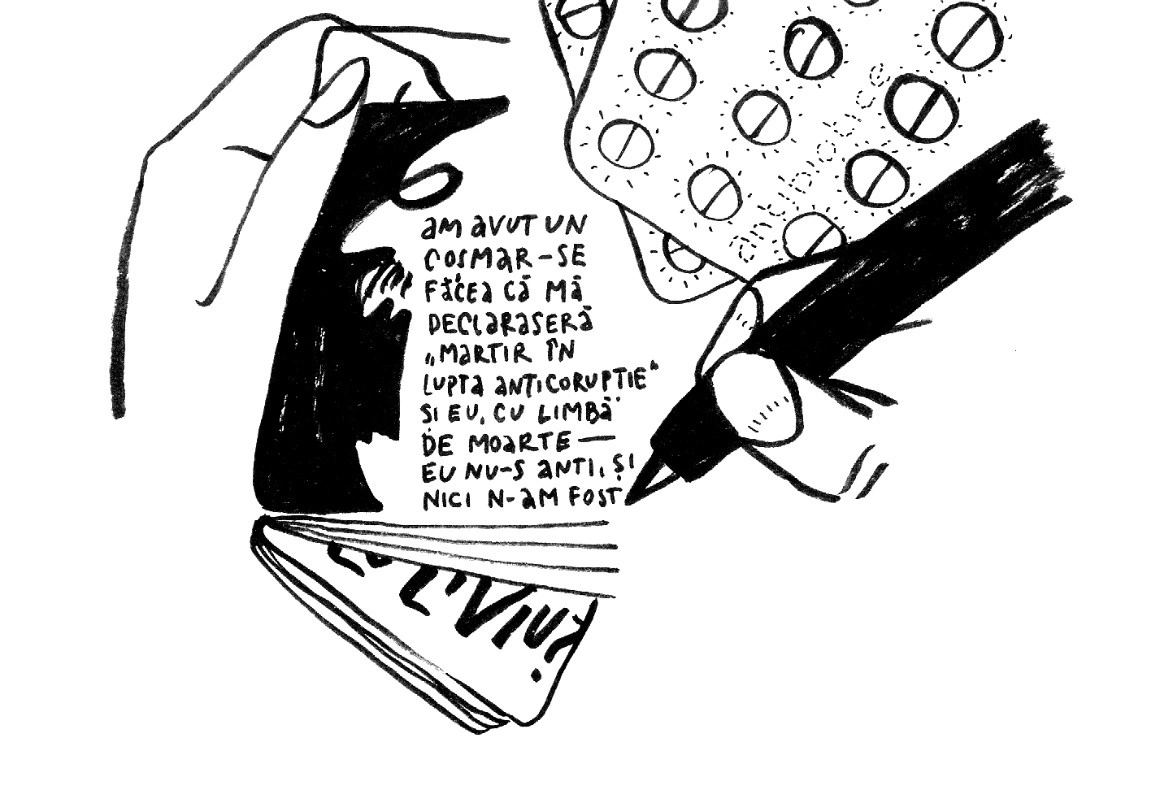 Ana Kun: Am făcut pneumonie anul trecut, ceea ce înseamnă că m-am preocupat o vreme cu respiratul și cam atât. Eram încă în convalescență, citeam pe net ce-a mai făcut numitul și mă lovea damblaua. Așa că m-am pus ușurel să-i fac câte un portret azi, mâine, poimâine, până am umplut un caiețel. Undeva pe la mijloc m-am hotărât la titlu, pentru că atunci m-am gândit la explorarea asta un pic mai metodic: deci avem copilăria, când visează omul să fie descurcăreț, că nu știa să zică corupt, timpul prezent cu insomnii cu tot (...se face dimineață și eu tot cu gândul la Soros. Ce-o fi cu mine, ce-o fi cu el, oare el se gândește la mine?), viitorul apropiat (ai mei or să mă sape … tot ei săracii) plus alte momente și schițe intermediare. I-am zis „Liviu” pentru că ăsta e tonul întregului fanzin, e scris la persoana întâi pentru că el se întreabă ce-i în propriul suflet. Plus că nu pretind să știu cu adevărat ce e și ce nu e, dacă e. E un personaj, până la urmă, și cel din fanzin, și cel de pe ecrane. Mă frapează la Dragnea zâmbetul pe care nu-l ascunde mustața, și care apare imediat ce minte, parcă zice, Ah, v-am făcut. Își privește propriul joc. Nu s-a scandalizat nimeni până acum, nici nu văd de ce ar face-o, e un fanzin scris și desenat (mâzgălit) cu duhul blândeții. Iar pe coperta 4, unde e un text explicativ, am scris: Nu e el Răul, nimeni nu e. Ce-i în sufletul lui Liviu e și-n al altora; el e în acest moment un fel de Iliescu de acum două’j de ani, și desene despre înaintașul lui au fost multe. Destule? Nu suntem vindecați de Iliescu, nu putem fi până nu e condamnat, până și asta au ei doi în comun. Deci nu m-am jenat să-i zic pe nume lui Nelu și nu s-a întâmplat nimic. Nimic rău. În schimb mi-au spus oamenii că s-au simțit mai bine - asta am vrut, în primă fază.