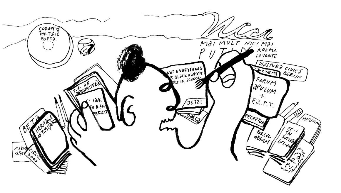 Transpir mai mult și bat câmpii mai puțin, cred. Colaborările sunt foarte mișto, mai ales că are lumea încredere să fac ce știu. Plus mă documentez destul de mult, ceea ce e o plăcere în sine. E fain și când se fac legături între proiecte, de exemplu am ajutat cu niște ilustrații oamenii de bine de la Forum Apulum, pentru un ghid despre comunismul românesc, apoi cu o ilustrație despre Mugur Călinescu, cel ce scria cu cretă mesaje anticomuniste și anti-austeritate în ‘82. Apoi m-a invitat Tur de Arhitectură să scriu despre patrimoniul Timișoarei, și am ales urmele revoluției române (gloanțe și graffiti), și cu ocazia asta am inventariat și mesajele în cretă de la Timișoara, șterse de ploaia din 18 decembrie 1989. În centrul Timișoarei mai sunt vizibile acum urme de gloanțe, chiar foarte aproape de celebrul balcon al Operei, dar și trei cruci desenate cu vopsea neagră, făcute în 17 sau 18 decembrie, ce marchează unul din locurile unde s-a tras și s-a murit. Sper să intre sub protecție și să nu dispară ca celelalte, la renovare.