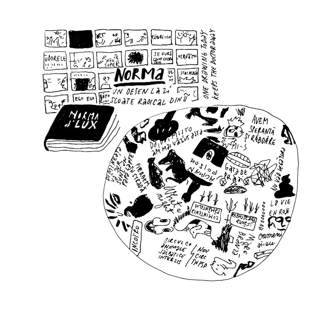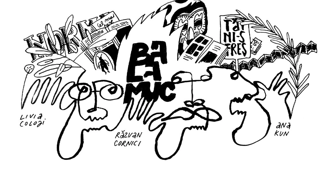 Balamucul ăsta este un loc fizic în Timișoara dar și un grup de 3 artiști, defalcat vine Livia Coloji, Răzvan Cornici și eu. În atelier, e ca la balamuc: fiecare absorbit de propriile preocupări, dar împreună la masă, la cheltuielile de întreținere și într-un proiect numit Norma, un desen la zi/scoate radical din pi (one drawing today/keeps the doctor away), unde inițial desenam/postam zilnic (atunci ziceam un desen pe zi...) iar după ce am trecut de 700 de zile/desene și am scos o carte de un kil jumate (editura Brumar, colecția Point), ne-am culcat pe lauri și acum desenăm și postăm mai la subiect, adică la zi. Ce e mișto la Balamuc este că invităm și pe alții, fie să bage la Normă, fie să participe la proiectele noastre: în primul an în atelier, 2014, am chemat artiști care ne plac să participe la Micul Dejun al Supereroilor (parafrază după Kurt Vonnegut) cu propriile interpretări ale supereroului/eroinei/eroilor etc. În 2015, în cadrul primei ediții a bienalei ArtEncounters, am găzduit Dan Perjovschi’s Zines. 1992-2015, o retrospectivă de fanzine plus un fanzin colaborativ făcut de noi și el. În 2016, am făcut Norma d’Lux, cartea despre care ziceam mai sus, cu un capitol dedicat artiștilor invitați la Norma, în 2017 a fost În Linii Mari // Caiete de Schițe (bibliotecă temporară de caiete de schițe și notițe aparținând celor 44 de artiști invitați), ca spațiu independent invitat în cadrul ArtEncounters, și anul trecut am participat la Mad(e) in Romania, un festival de artă politică, unde am rostogolit Norma Globulară și am lansat Ce-i în sufletu’ lu’ Liviu? Unul pe an, nici mai mult nici mai puțin.