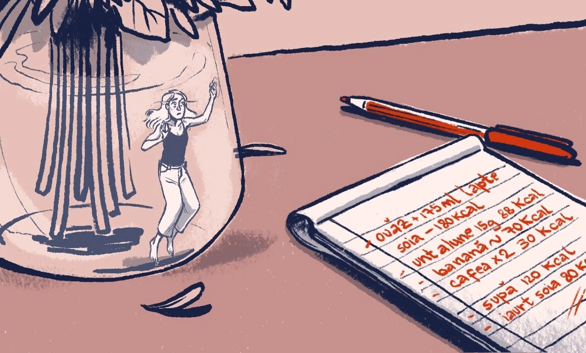 Învăț cu interes din materialele primite la terapie despre tulburările de alimentație și despre comportamentul meu, care nu se încadrează, de fapt, nici la anorexie, nici la bulimie, ci e undeva între. Dar refuz cu încăpățânare orice inițiativă care mi-ar schimba obiceiurile. Frica cea mai mare a unui pacient anorexic este să nu ia în greutate. Terapeuta îmi propune să îmi notez ce mănânc într-o zi, probabil ca să-mi arate că mănânc extrem de puțin și sărac nutritiv, și am voie să fiu mai puțin restrictivă. Nu are efectul dorit - în schimb, devin dependentă de senzația de control dată de documentarea meselor zilnice. N-am fost niciodată genul care să țină un jurnal, însă de-atunci încoace, următorii ani din viața mea sunt marcați în notițele din telefon pe liste interminabile cu absolut tot ce mănânc. Calculez caloriile cu un avânt necaracteristic cuiva care n-a mai făcut mate dintr-a opta.