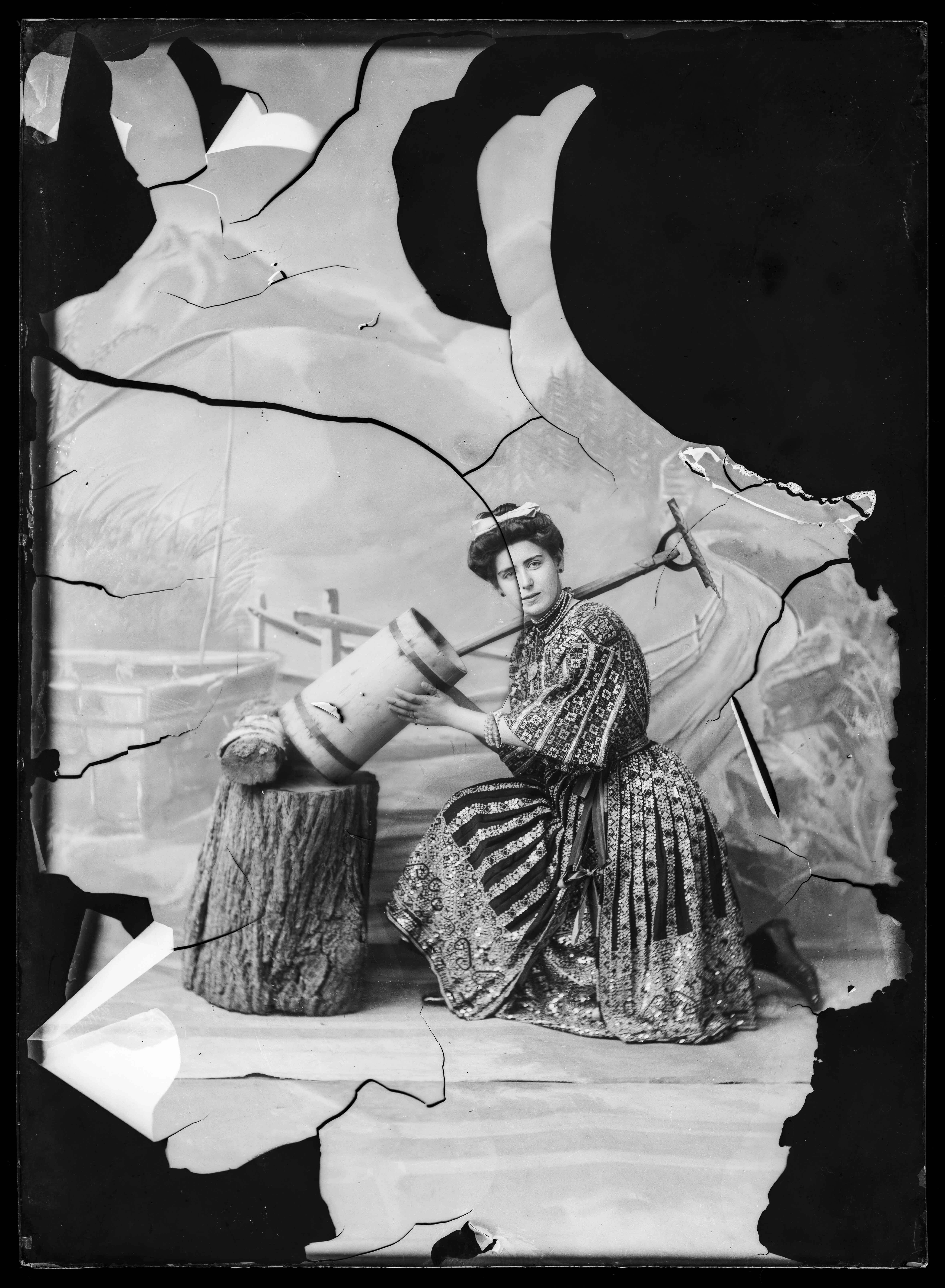 O altă tensiune prezentă în imaginile expuse este cea dintre un naționalism asumat și viziuni ceva mai moderne ale reprezentării genului. O găsim în cadrul grupajului de portrete, cu imagini din prima jumătate a secolului XX, dar și câteva reprezentări de secol XIX. Subiecții apar reprezentați în tot soiul de contexte, de la țărani și țărănci în port național, la familii burgheze. Fiind vorba în mare parte despre fotografii de studio, costumele, posturile și recuzita sunt atent coregrafiate și vorbesc despre statutul celor portretizați. Cu puține excepții, lumea femeilor este clar delimitată de cea a bărbaților, mai ales în portretele de familie, unde femeile apar în apropierea copiilor, iar figura masculină este cea dominantă. Nu pot să nu remarc stereotipuri încă actuale, în care femininul este asociat cu grija, delicatețea, supunerea și familia, în timp ce masculinul reprezintă acțiunea, decizia, puterea și intelectul. Pe scurt, o Românie aflată în plin patriarhat tradițional. La sfârșitul secolului al XIX-lea și pentru o bună parte a secolului XX, munca nu le făcea independente pe femei, iar căsătoria era văzută ca un aspect necesar supraviețuirii lor. Unele fete nu aveau acces nici măcar la un mariaj impus în absența dotei, o mică avere ce intra tot în administrarea soțului după căsătorie. În acest sens, mi-au atras atenția o serie de fotografii cu miri și mirese înrămate chiar de Oroveanu folosind rame colecționate de el. Scormonind prin albumele de familie, găsești imagini asemănătoare, ceea ce mă face să mă gândesc cum repertoriul genului se construiește în memoria colectivă printr-un imaginar fotografic din care fiecare deținem propriile fragmente.
