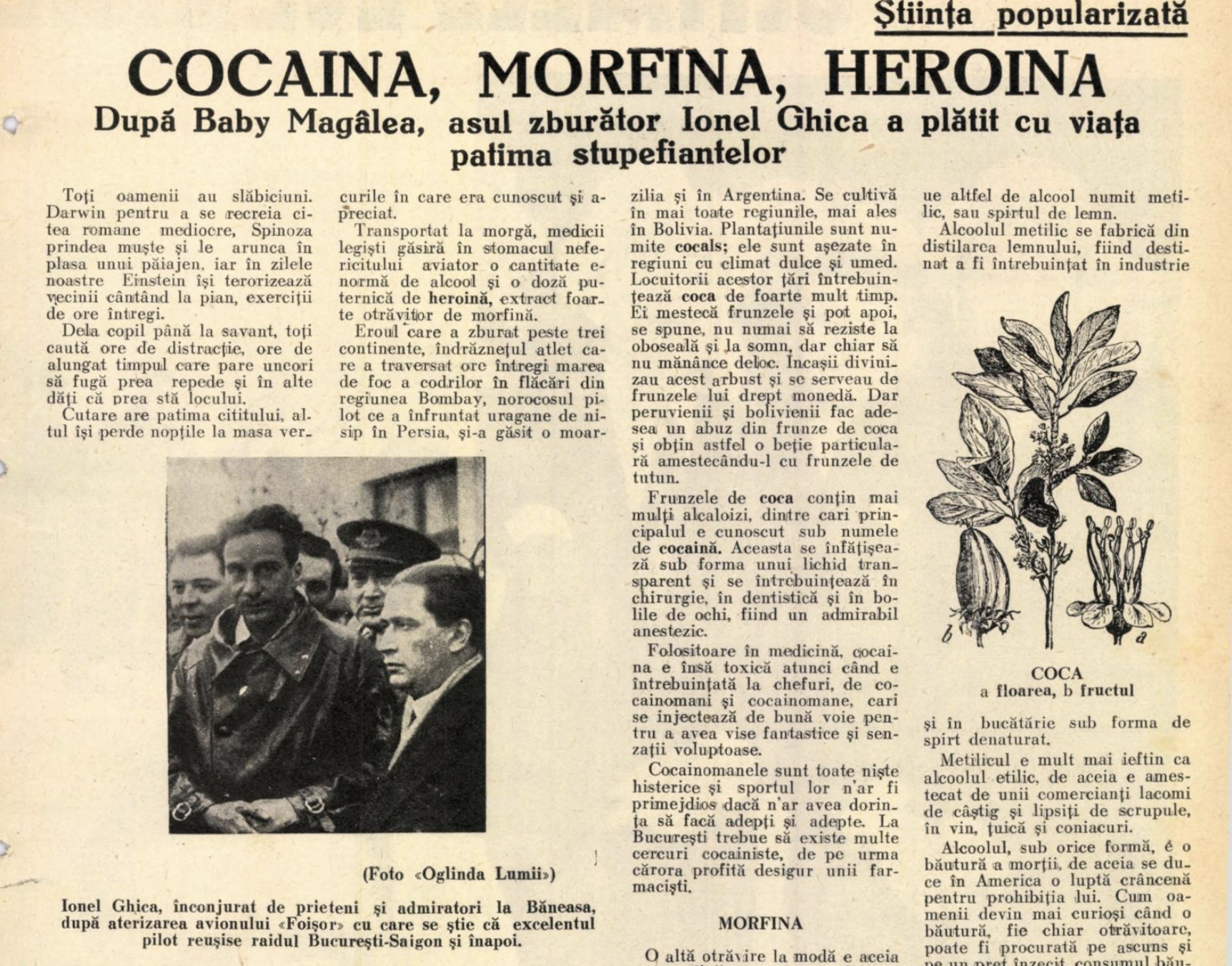 Potrivit acestui articol, medicii legiști „găsiră în stomacul nefericitului aviator o cantitate enormă de alcool şi o doză puternică de heroină”. Plus cocaină, pe care o prizase cu prietenii lui în localurile bucureștene Zig-Zag și Roata lumii. Câțiva dintre cunoscuții lui Ghica au fost arestați în zilele următoare, pe motiv că ar fi fost traficanți de stupefiante. Unele publicații au vorbit chiar despre posibilitatea ca Ionel Ghica să fi adus drogurile din Saigon, fiind de părere că însăși performanța lui aviatică a fost susținută de consumul constant de cocaină.