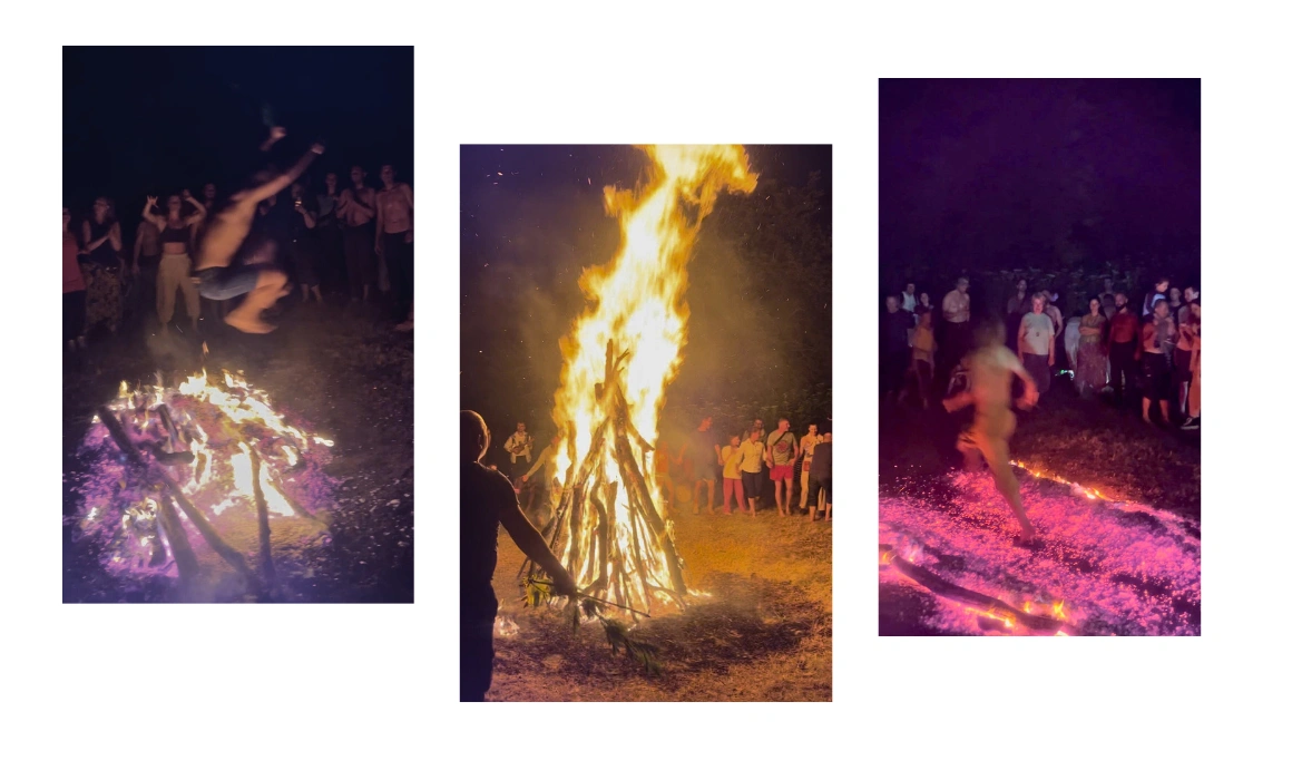 Când s-a făcut noapte, domnul cu paturile de cuie deja pregătise un mare foc de tabără. Au urmat dansurile cu ritm intens în jurul focului, cu muzică live – jam session de rock psihedelic. Era încurajată o mișcare prin care energia negativă era aruncată în foc prin mișcarea picioarelor înspre flăcări, însoțită de strigătul „Uh-HAAA!”. O scenă midsommariană în care îți dai seama, conform discuțiilor cu aceeași doamnă din Ucraina de la începutul textului, că o parte din oamenii de aici ocupă diferite roluri în societate, în viața de zi cu zi, iar apoi vin la festival și refulează în moduri nemaivăzute. Pe măsură ce focul cel mare și-a mai redus în mod controlat din înălțime au început săriturile celor mai în formă peste el. Ambiția fiecărui săritor se dovedea în încercarea de a obține săritura cea mai înaltă, cea mai centrată, cea mai lungă ca distanță. A existat un punct în care focul a fost redus la un drum de jar, peste care mai mulți participanți la festivalul și-au arătat tupeul și au mers cu tălpile goale. Unii în fugă, alții mergând liniștiți cu copiii pe spate. După atâta „incendiu” am simțit nevoia să mă întorc în pădure către dimineață, ca să fac o baie în acel fir de apă de lângă banya. La ora aia, după un asemenea ritual, apa numai rece nu se mai simțea.