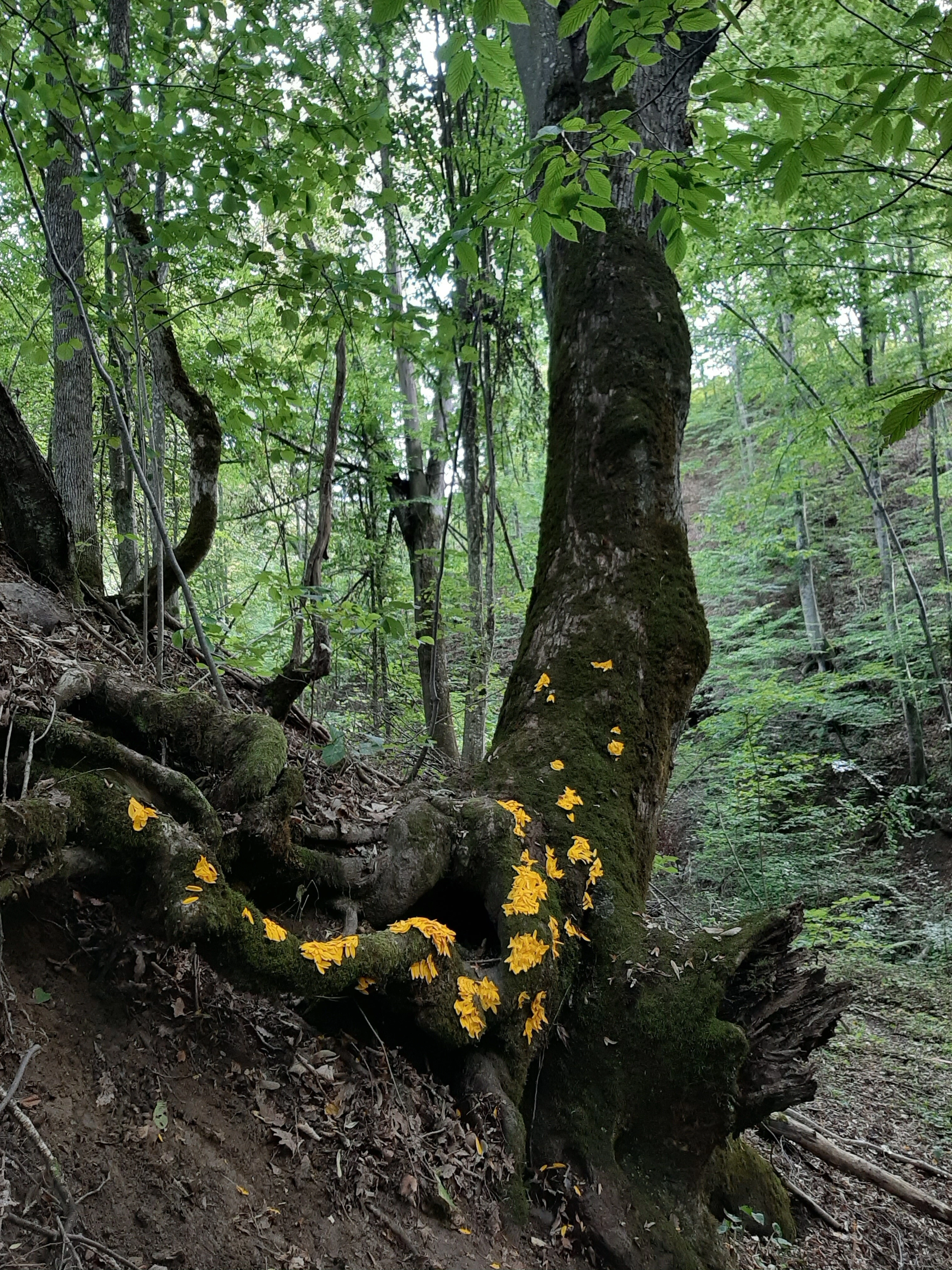 Prima dată când am dat turul terenului a început să plouă. Coborând în pădure, am găsit mai multe salamandre care ieșiseră la plimbare. Salamandra salamandra este o specie pe cale de dispariție în Europa, dar în rezervație se pare că trăiește bine mersi. Și foarte rapid s-a născut tema asta: ce-ar fi să generăm o lucrare care să susțină ideea de coexistență a salamandrei cu pădurea propriu zisă în care trăiește? După aceea, s-a mai născut un subpunct al acestei abordări. Salamandra Salamandra produce un fel de acid pe piele, pentru protecție. Această salamandră la scară mare (lucrarea are vreo 3 metri lungime) pune și problema faptului că acidul protejează și animalul și natura. Practic, te imersează în tema protecției. Lucrarea s-a născut foarte simplu: florile de nap galben erau foarte prezente. Le-ai luat și le-ai așezat într-o compoziție, dar super efemeră. În trei zile n-au mai fost. S-au uscat, și-au pierdut culoarea și au dispărut pur și simplu.