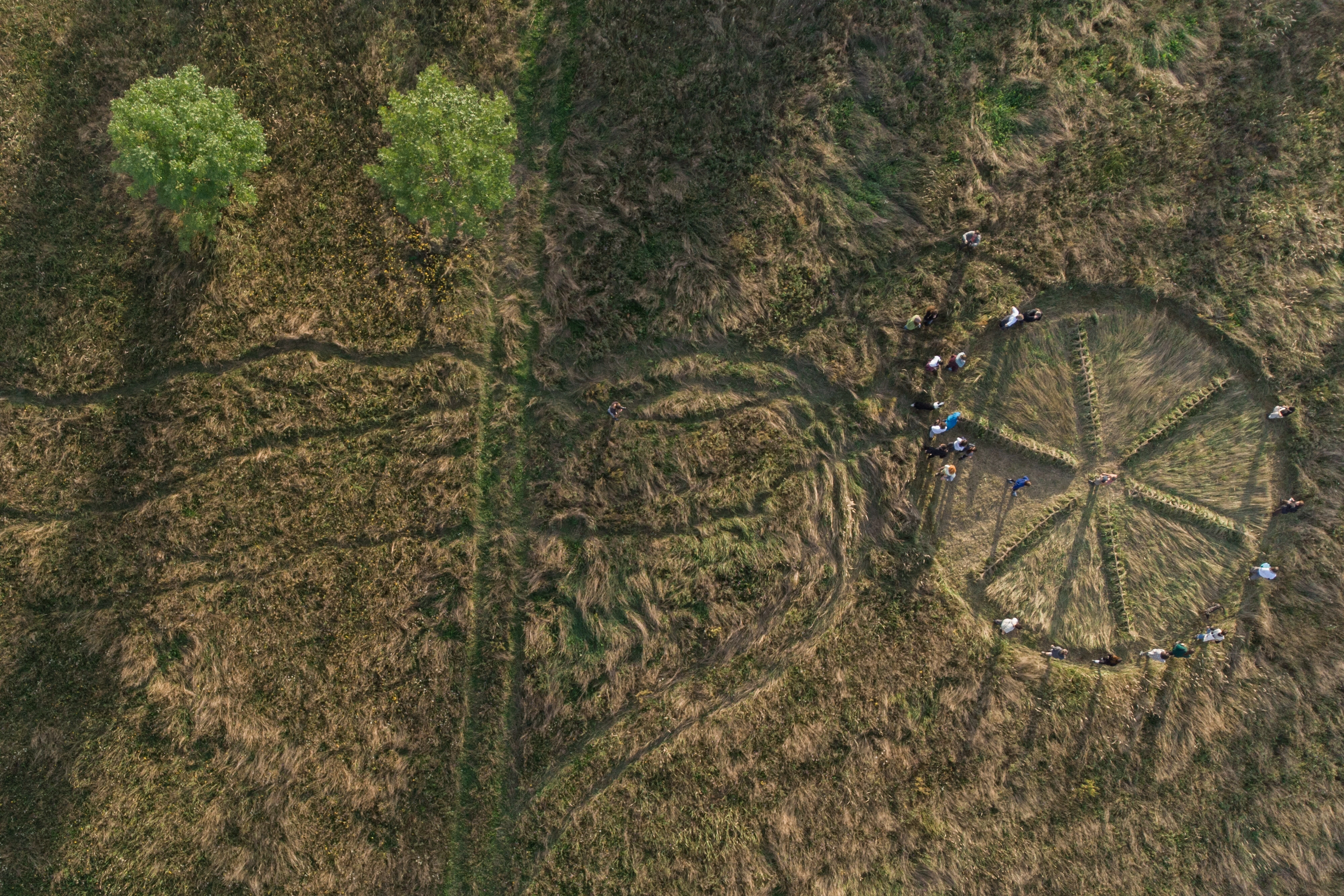 Mie îmi place foarte mult această privire serenă: că, de fapt, asta este. E un fel de meditație până la urmă. E mai important nu rezultatul, ci traseul pe care-l faci, și cum îl faci, cât de conștient ești. De exemplu, Hidden Garden a fost concepută în funcție de ce a găsit echipa pe teren. E un teren destul de mare, sunt vreo 130 de metri pe 40-50 de metri și fetele au făcut totul doar cu corpul lor. Tot ce a rezultat e un action. Totul e iarbă călcată. Și au așezat câteva țigle sparte, care e tot pământ, dar transformat prin intermediul focului. Filmulețul are integrat în muzică sunetul pașilor pe țiglă. Și e un proiect care nu se mai vede, gata, a dispărut. A fost și a plecat. Foarte rapid.