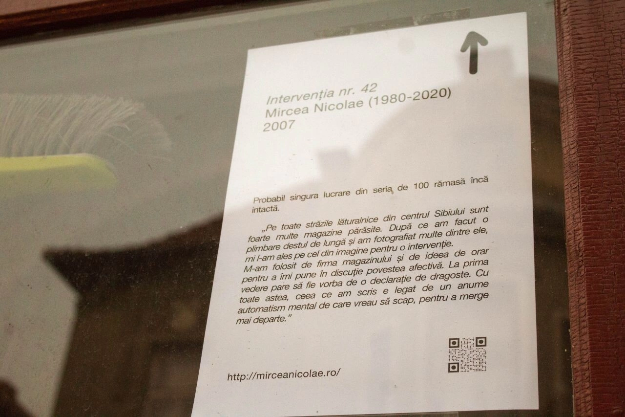 La început n-a fost cuvântul, ci gândul: Ceea ce am scris e legat de un anume automatism mental de care vreau să scap, pentru a merge mai departe, scria artistul Mircea Nicolae despre lucrarea lui de pe fațada micului magazin din centrul Sibiului.