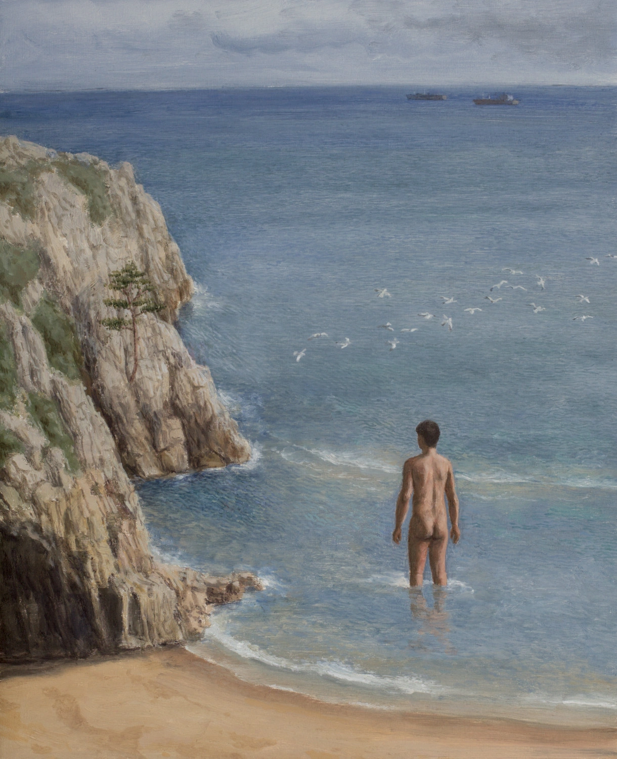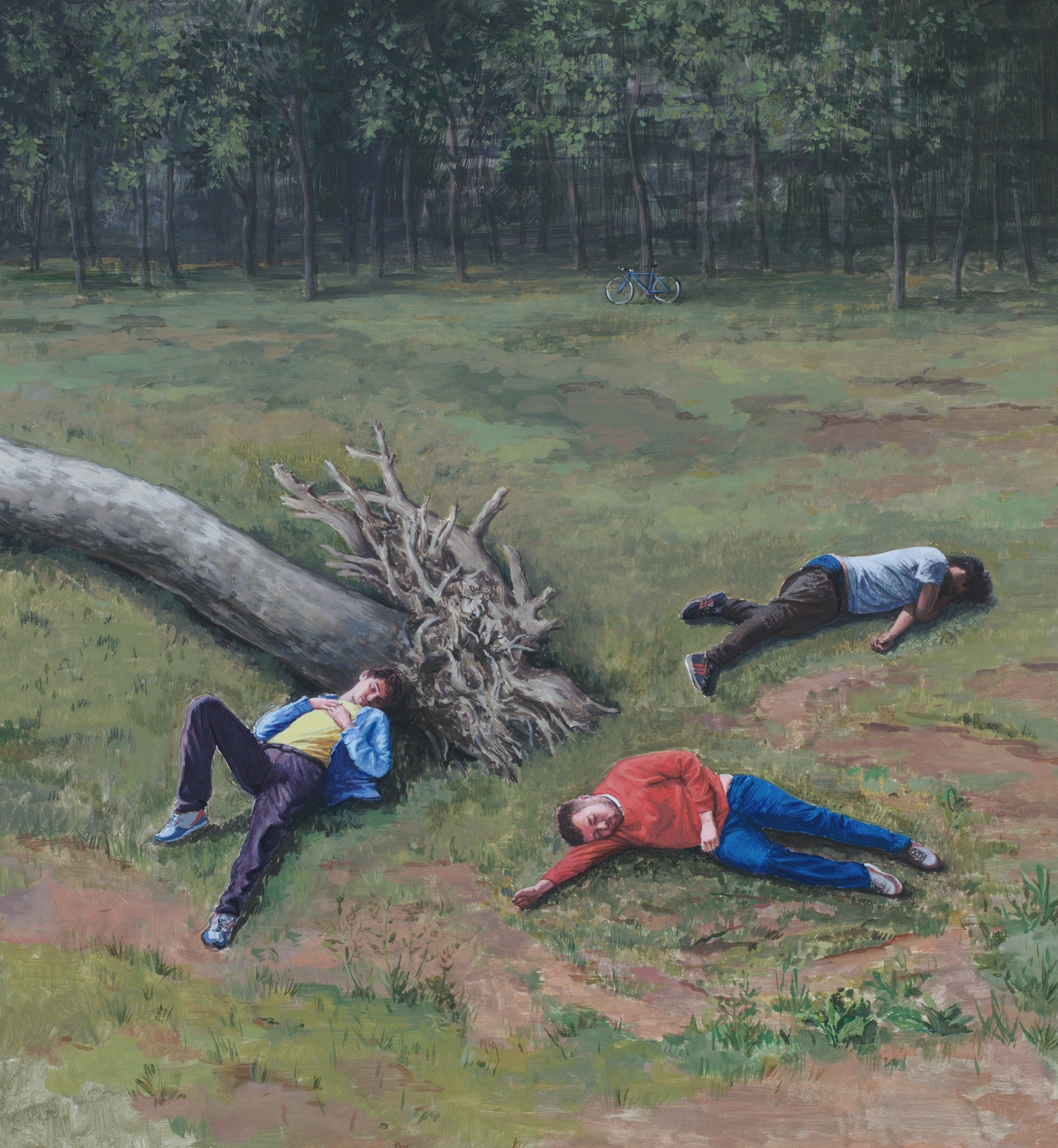 Asta se numeşte „Soldaţii”. În imagine sunt cei de la [trupa] K-dija, Rusu şi Flore. Văzusem pe net o poză cu ei dormind în iarbă. Nu ca aici, erau cumva cap în cap. Mi-a plăcut foarte mult. Nu ştiam atunci cine sunt. Am făcut pictura pornind de la cea a lui Van Eyck, cu cele trei Marii la mormântul lui Isus şi cei trei soldaţi adormiţi. Uitându-mă la ea într-o dimineaţă, mi-am dat seama că soldaţii sunt cam toţi nişte puşti. Am vrut să-i redau aşa în pictura mea şi mi-am imaginat că sunt nişte soldaţi care se întorc de pe front şi pică într-un somn atât de adânc, că devin cumva dezrădăcinaţi, precum copacul de lângă ei. Un somn prin care încearcă să-şi recapete energia şi să revină la viaţa firească. E foarte metaforic.