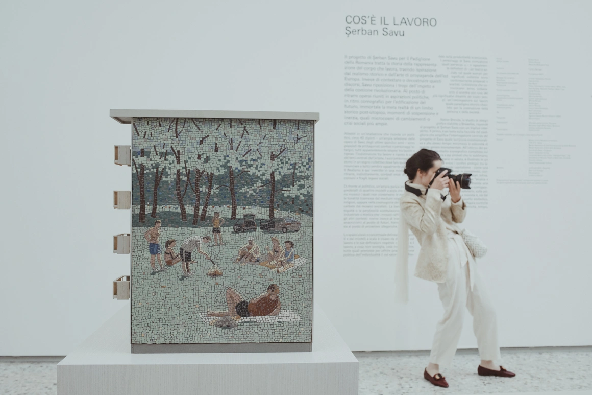 Aceeași scenă stătuse la baza unei picturi din 2019, intitulată „Adevărata natură”, și a unui mic mozaic pe care pictorul l-a expus în 2021 la Muzeul de Artă Contemporană din Bucureşti, pe o machetă a blocului în care a copilărit. „E o scenă neideologizată cu oameni de la bloc, care se pot recunoaşte şi care mergeau la grătare de 1 Mai,” spune Savu. A dus această instalație și la Veneția, alături de multe alte lucrări legate de muncă și de pauzele de la ea, pictate de-a lungul timpului. Ele sunt inspirate de arta oficială pre-’90, care propaga un ideal asiduu al muncii socialiste, dar pe care pictorul clujean o scutură de ideologie.
