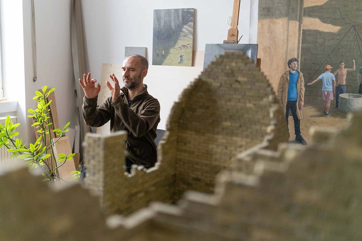 Lucra la o pictură nouă când ne-am revăzut şi era absorbit doar de ea: pe perete era lipită de data asta o pânză mare, cu cinci oameni care făceau măsurători într-o zonă cu săpături. Varianta ei în miniatură se sprijinea alături, pe un şevalet. „Ăsta e un sit arheologic din Neolitic. Mă interesează și tema ruinei şi a arheologiei. Sau mai degrabă trecerea timpului, ăsta e de fapt subiectul principal. Textura pe care o lasă timpul, toată patina aia.”