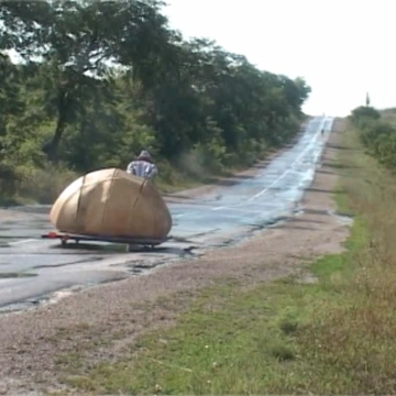 În mămăligă se putea adăposti un om, tot acolo putea să‐şi care bună parte din avuţie. Ghenadie şi‐a croit pentru drum un costum din rafie, acelaşi material din care sunt făcute sacoşele care circulă fără oprire între Moldova şi restul lumii. Un student la actorie a filmat toată aventura. Până la ieşirea din oraş au ţinut trotuarele mai late, apoi marginea drumurilor între sate, pe lângă maşini ce goneau spre Occident şi căruţe ce rămâneau în sate.