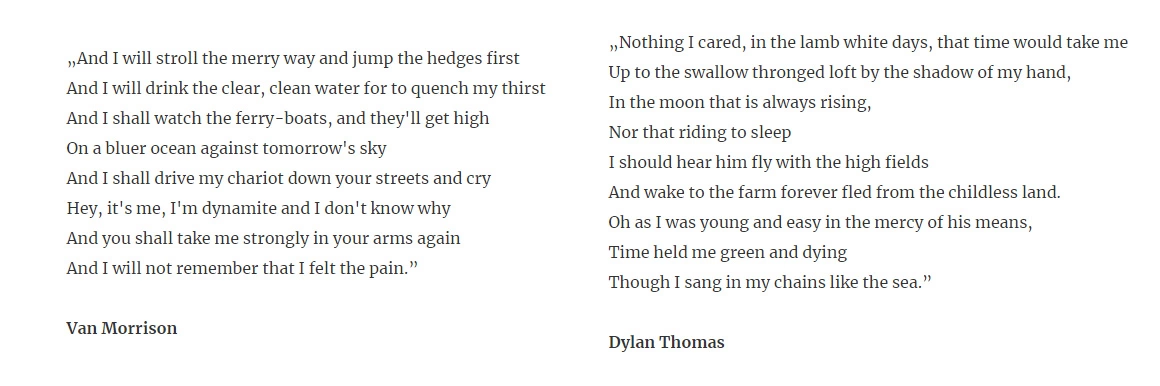 Cu o formă de „adevăr” obținut din „poetic” are legătură, cred, și „Astral Weeks”. De-a lungul celor 47 de minute, cât durează albumul, suntem martorii unui om care invocă o formă de adevăr, așteptând-o să apară. S-a scris enorm despre versurile lui Van Morrison, despre forma lui de poetic vag, luminos, aproape pastoral, în care natura își câștigă un statut de muză pe care-l avusese în poezie, dar niciodată în muzica contemporană comercială.
