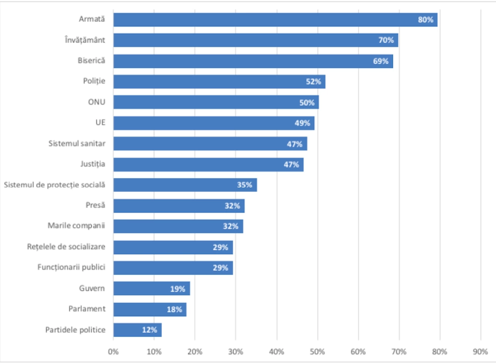 La coada clasamentului se află guvernul, parlamentul și partidele politice, în care 80% dintre români nu au încredere. Adică cele mai importante instituții ale unui stat, care au puterea de a structura modul de funcționare pentru toate celelalte instituții: armată, educație etc.
