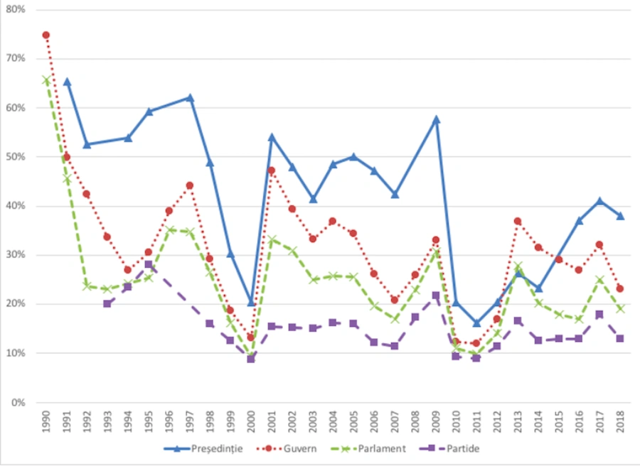 Cât despre 2018, anul în care am sărbătorit 100 de ani de la Marea Unire „mai dezbinați ca niciodată”, atunci s-a înregistrat iar o scădere mare a încrederii populației în instituțiile statului. Doar că de data asta nu factorul economic a fost cauza principală, ci tensiunile din sfera politică, printre care și cele legate de legile justiției.