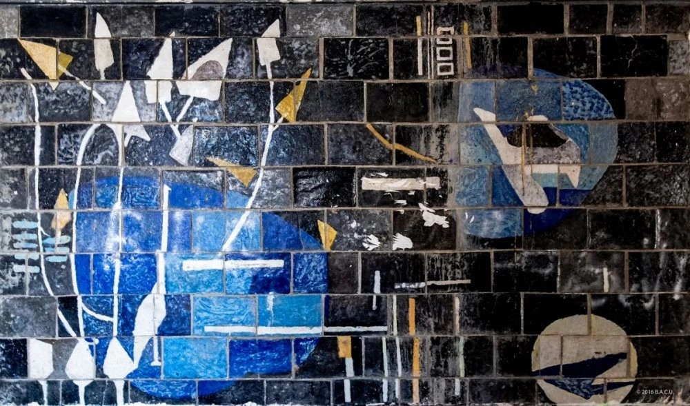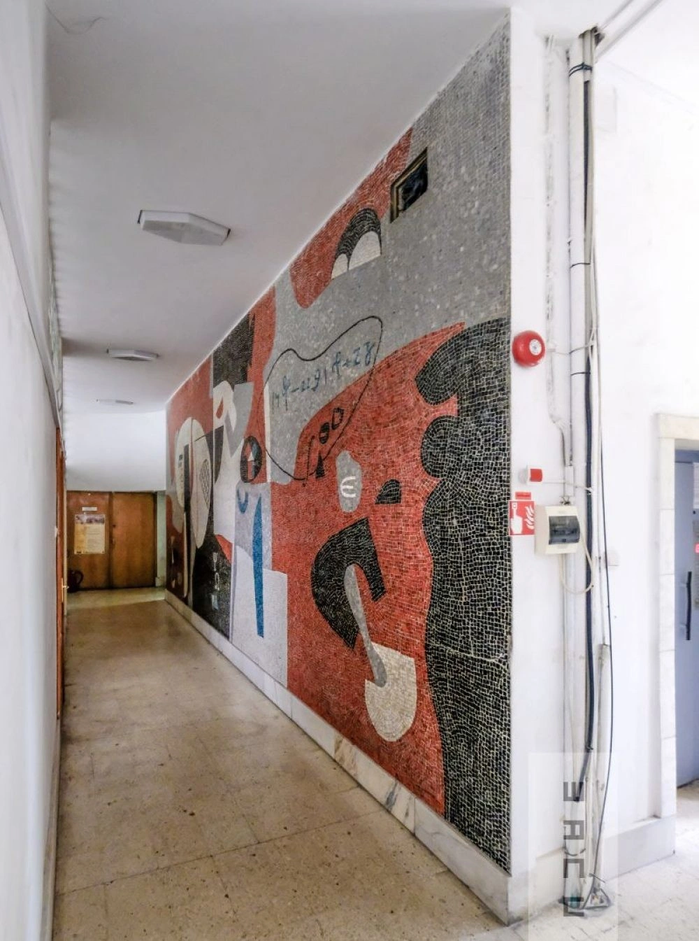 Clipul British Pathé de mai jos poate să te ajute să-ți faci o idee despre cât de modernă era clădirea construită în 1966, în zona Dudești. Ea mai există și astăzi, iar Dumitru Rusu speră că la fel se poate spune și despre mozaicurile sale, realizate de artiștii Constantin Blendea, Mircea Velea și Constantin Berdilă. Mozaicurile împodobesc holul principal al clădirii, precum și sala de așteptare a secției de balneofizioterapie și radiologie. Mozaicul din holul principal se află într-o stare de neglijare avansată și e obturat de compartimentarea unei farmacii. E unul dintre cazurile în care înscrierea lucrării pe lista monumentelor istorice ar contribui la redarea ei privirilor celor care așteaptă să se trateze.