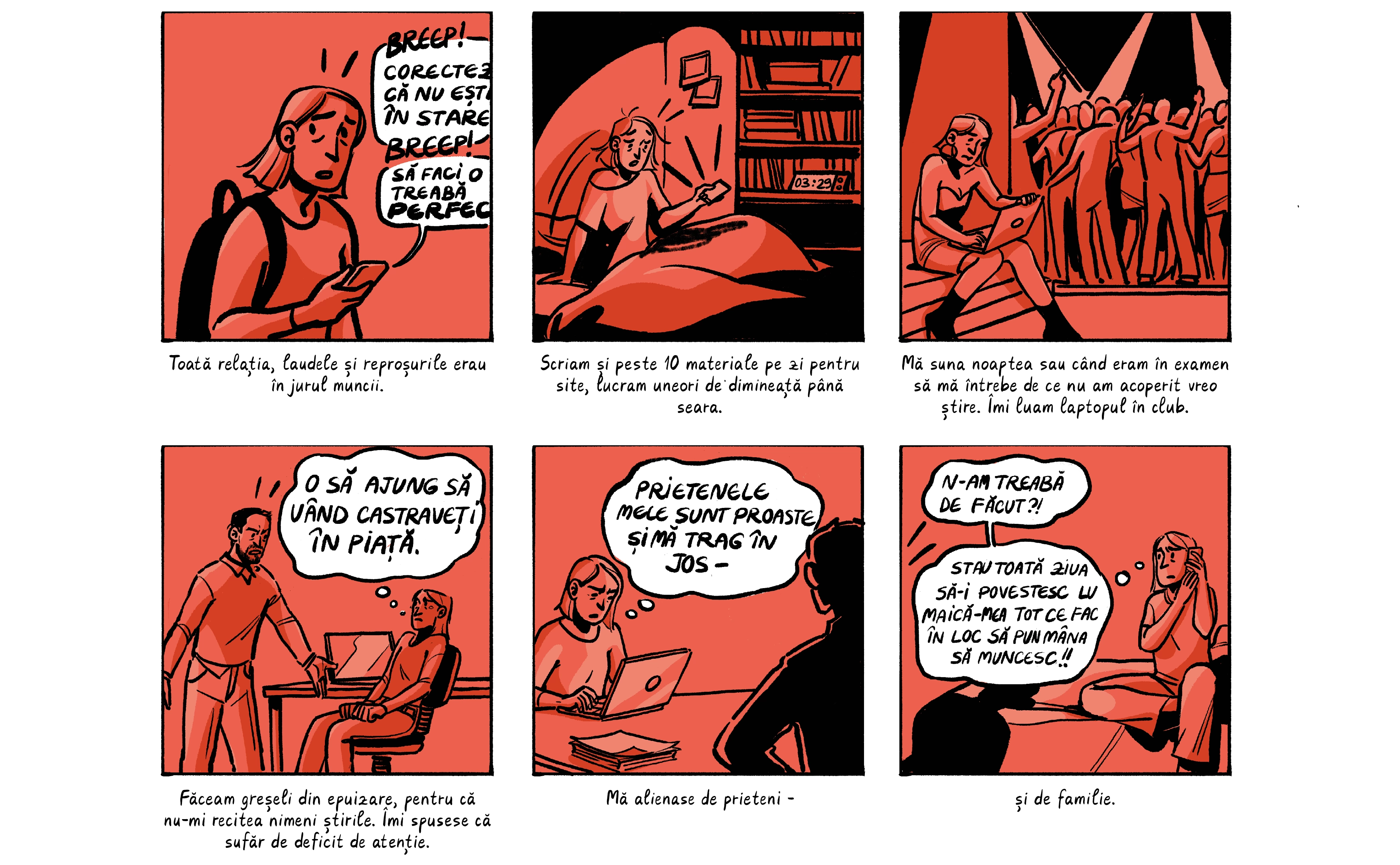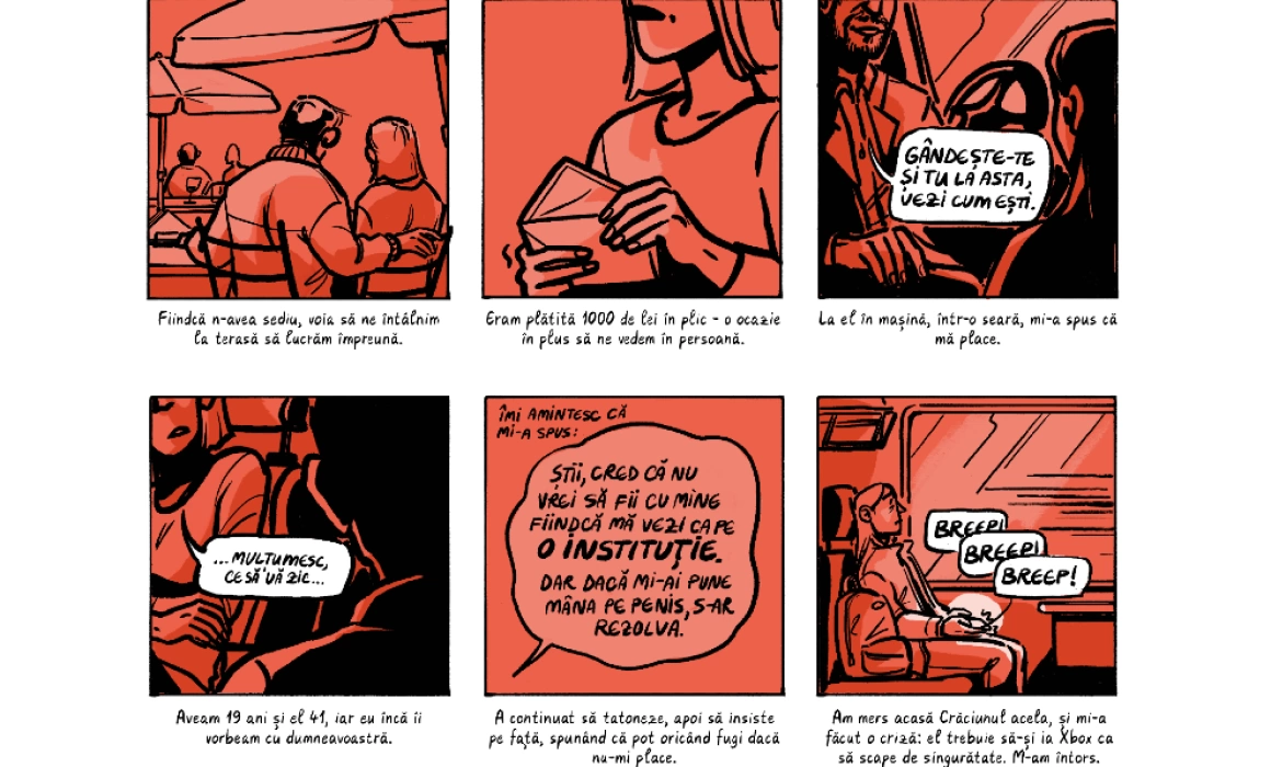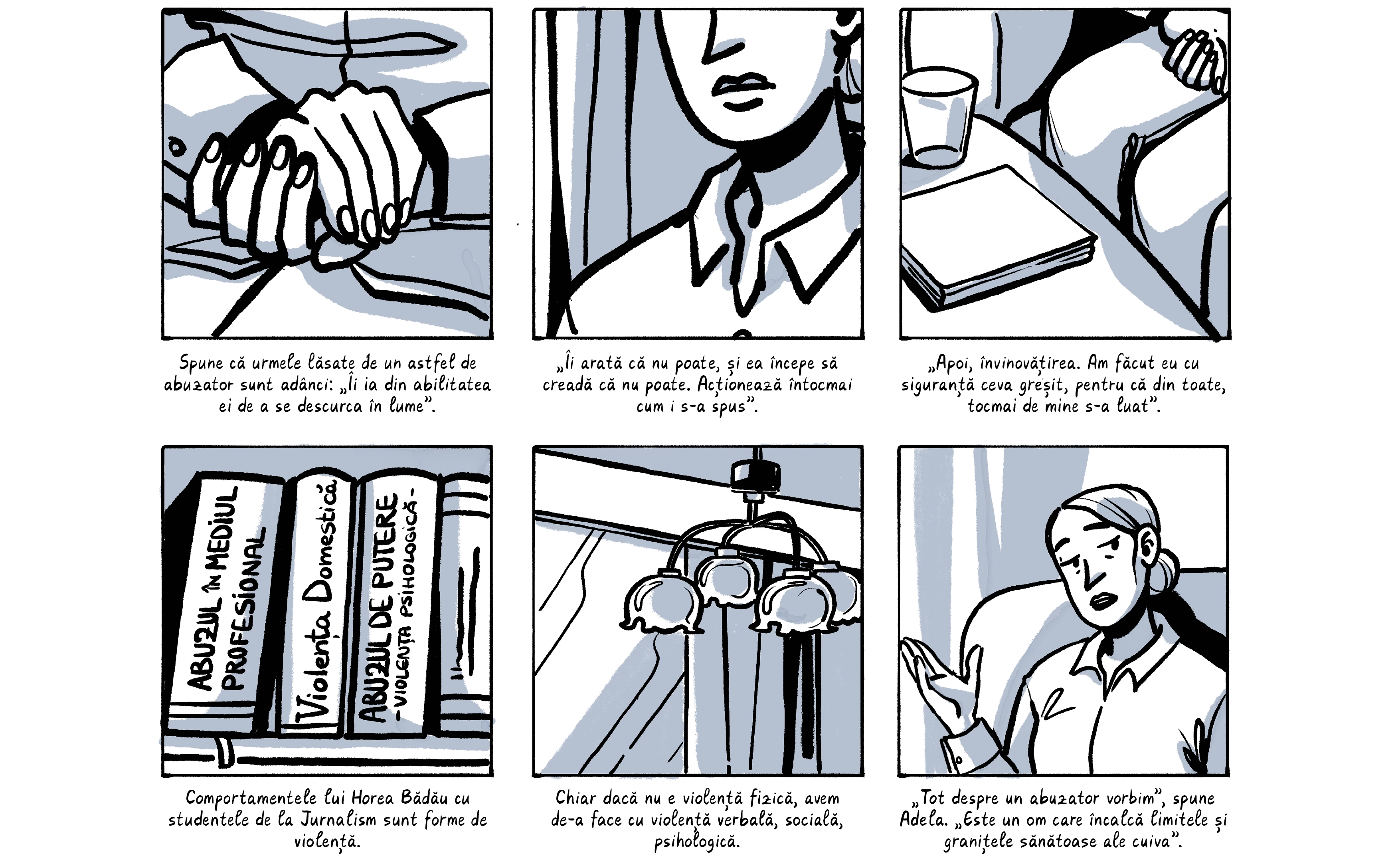 Banda desenată de mai jos preia o parte dintre poveștile absolventelor, care apar cu pseudonime ca să le protejăm identitatea. Ele sunt contextualizate de o discuție despre nevoia de a trata cu mai multă seriozitate abuzurile din universitățile din România, unde o treime dintre studente spun că au fost hărțuite sexual. Dacă reacția celor peste 200 de studenți actuali de la FJSC, care au semnat o sesizare cerând măsuri din partea facultății și universității, poate fi folosită ca o măsură a interesului, putem spune că ei vor această discuție.