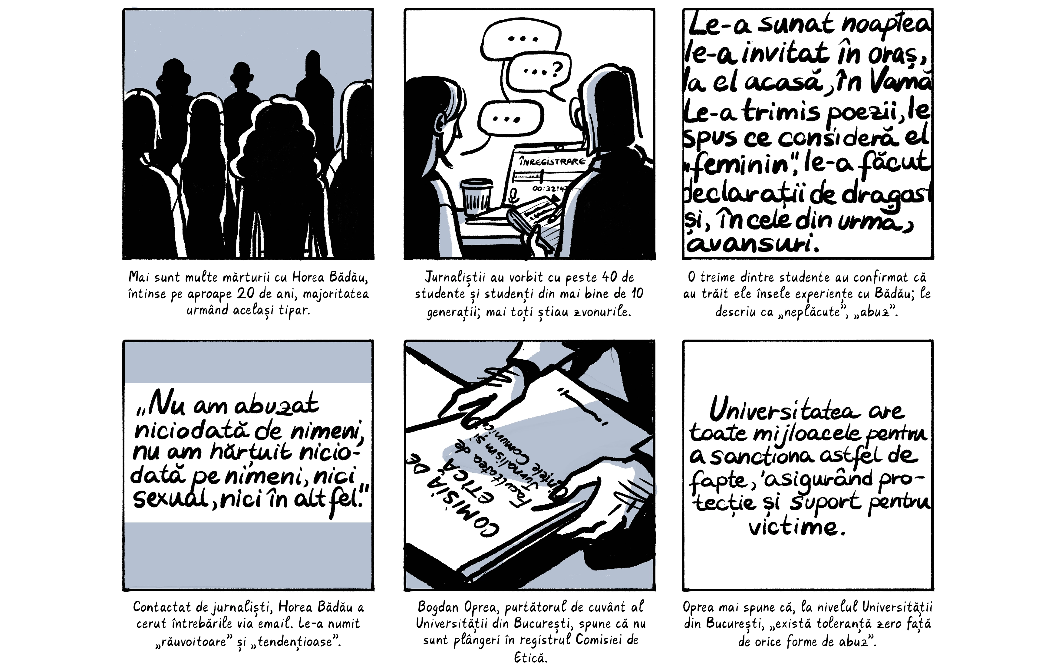 Cine a trecut prin Facultatea de Jurnalism și Științele Comunicării (FJSC) a Universității din București (UB) în ultimii ani a auzit că Horea-Mihai Bădău, lector universitar doctor, face avansuri studentelor. 14 foste absolvente și-au spus în RISE Project poveștile, confirmând vorbele de pe holuri. Acestea descriu interacțiunile cu Bădău ca fiind încălcări ale granițelor relației profesor-studentă, abuzuri de putere, chiar hărțuire sexuală. Psihologii, juriștii și activiștii cu care s-a consultat RISE Project confirmă că au fost comportamente inadecvate.