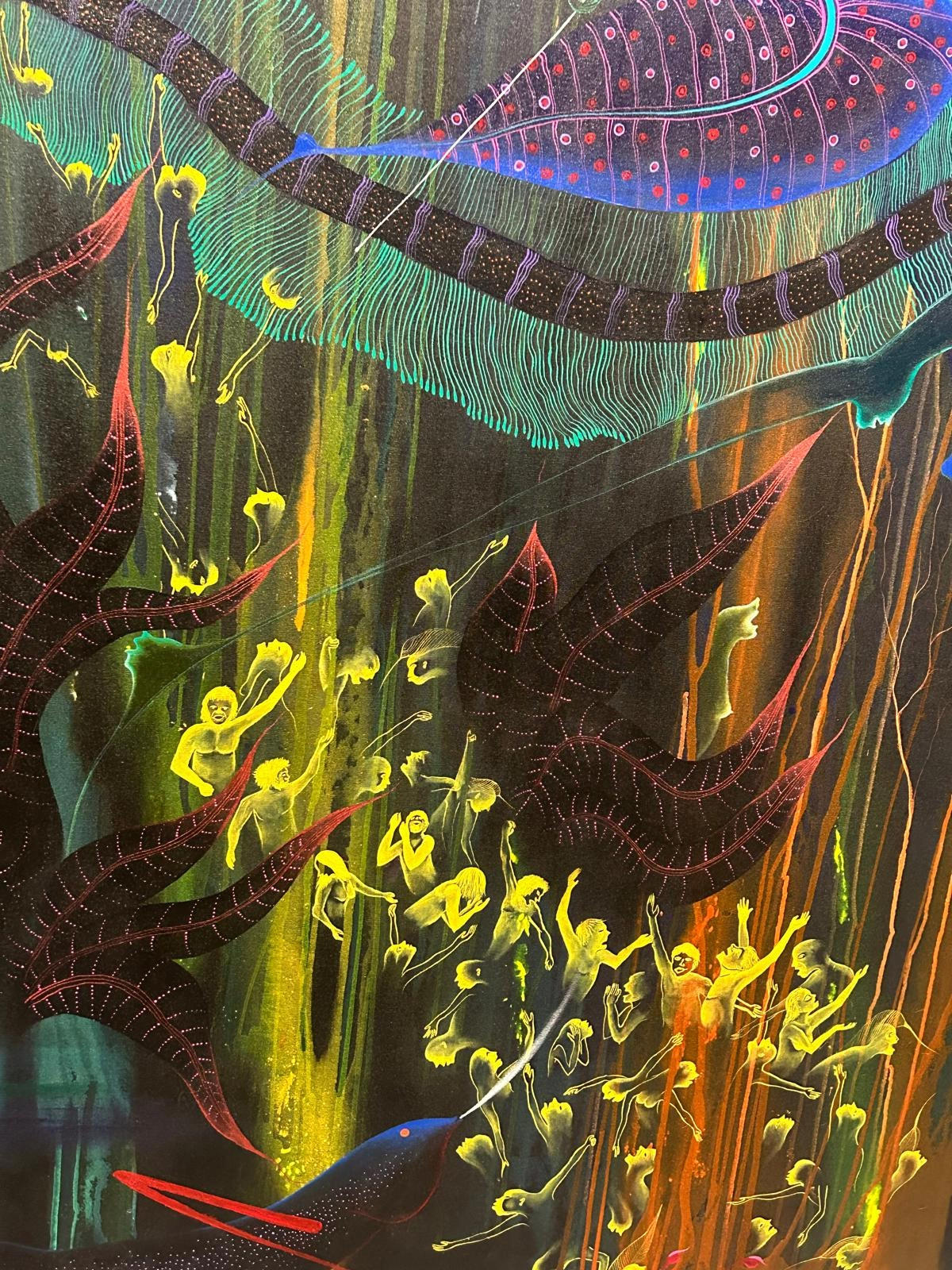Dintre plăcerile expoziției centrale o să amintesc tăieturile în hârtie ale artistului-„fluture” chinez Xiyadie, cu ale sale explozii queer, cu corpuri acoperite de flori care își consumă substanțele. O senzație a ediției este un alt artist queer, un recent succes de piață, tânărul și prolificul pictor american Louis Fratino, care, la rândul lui, își exprimă influențele preluate dintr-un modernism global al corpului masculin și spațiului domestic. Lucrările artistei de origine quechua Violeta Quispe sunt o răsturnare a unor logici patriarhale, inclusiv din comunitatea acesteia, de a cărei mitologie se folosește, și prin calitățile orgiastice și interspecifice ale tablourilor sale. Preotul și botanistul yoruba Ṣàngódáre Gbádégẹsin Àjàlá pictează cu precizie, pe textile mari, personaje abstractizate aflate în situații domestice sau inițiatice. Lucrări de dimensiuni ample sunt și cele ale artistei brute elvețiene Aloise, care a trăit cea mai mare parte a vieții într-un ospiciu. Personajele ei, realizate câteodată din materiale surprinzătore, uneori chiar din pastă de dinți, de exemplu, sunt surprinse în îmbrățișări zeloase. Printre preferatele mele se numără și lucrarea aflată la intrarea în expoziția internațională din Arsenale. Acolo te întâmpină o impresionantă structură din țesături și legături de poliester și his-vis a colectivului de artiste maori Mathaao. Lucrarea, câștigătoare a Leului de Aur, urmărește tranziții de la întuneric la lumină într-o cheie cosmologică, pe niveluri, de la maternitate la munca lucrătorilor trecuți cu vederea. Legătura stranie cu pământul a indigenului sau a celui legat prin credința sa de acel pământ e explorată și în peisajele iconice ale Vestului american, acoperite cu motive folclorice de artista de origine cherokee Kay WalkingStick, dar și în extraterestrele tablouri ale deșertului realizate de pictorul libanez Aref el Rayess.