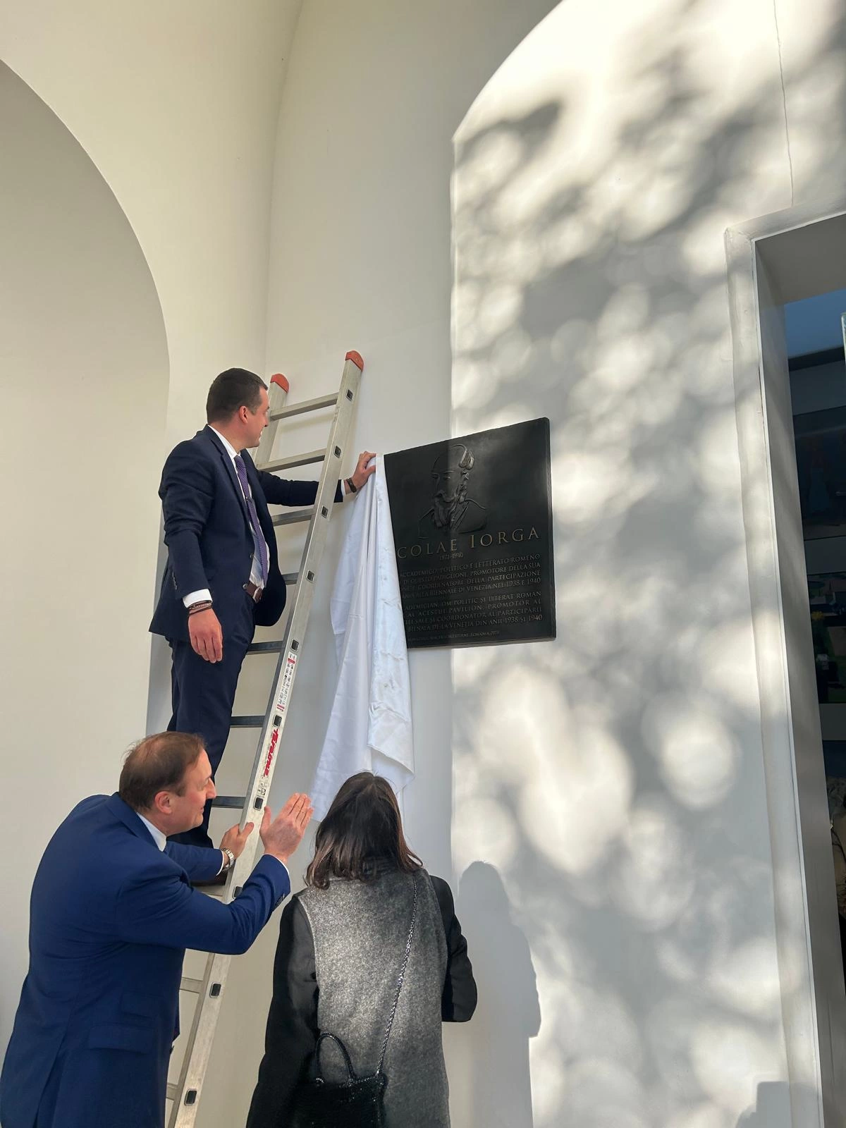La Pavilionul României există și o surpriză discutabilă. Într-un context politic precum cel de azi, la Pavilionul României reprezentanții ICR Veneția au instalat o placă memorială, realizată de artistul Mircea Cantor și dedicată lui Nicolae Iorga, fondator în perioada interbelică al institutului din Veneția și Pavilionului României. Placa ar fi fost montată anul trecut, dar în perioada preview-ului se făceau repetiții pentru o a doua inaugurare a sa. Poate ca nu e chiar cel mai bun moment pentru astfel de gesturi simbolice. Printre altele, Iorga, a fost și un fervent antisemit, prieten al fasciștilor italieni și asociat cu figuri care n-au rămas tocmai nepătate în istoria României, precum regele Carol al II-lea și politicianul de extremă dreapta A.C. Cuza.