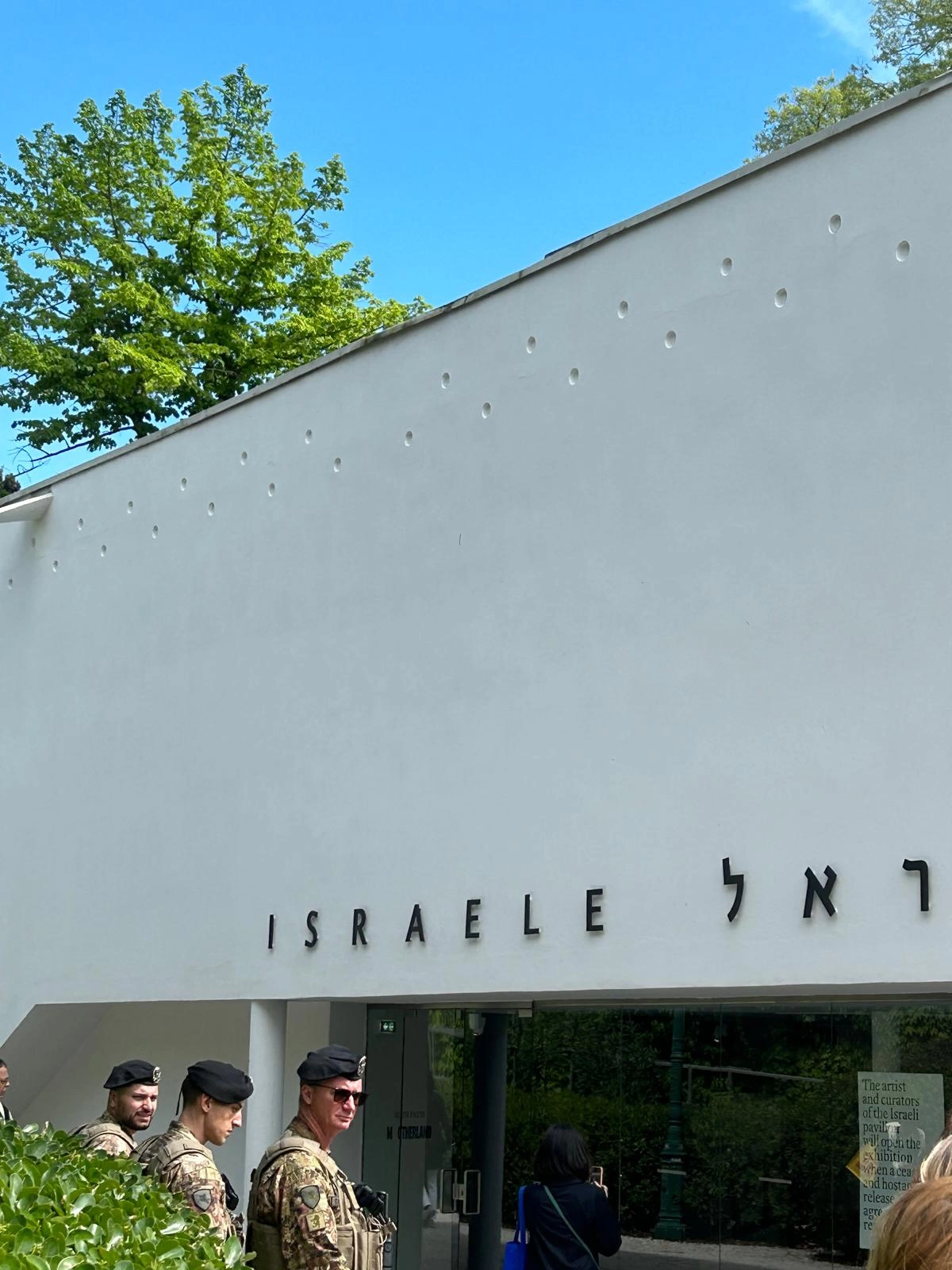 În perioada dinaintea Bienalei s-a format Alianța Art Not Genocide (ANGA), care, pe lângă încercările de a scoate în evidență incongruențe ale instituției Bienalei, are ca scop principal închiderea Pavilionului Israelului. Gruparea a inițiat în acest sens o petiție, semnată de peste 24.000 de artiști și lucrători culturali. Rezultatul a fost închiderea parțială a pavilionului respectiv. În prima zi în care au putut fi vizitate pavilioanele naționale, la intrarea în cel al Israelului a fost pus un afiș care menționează că acesta rămâne închis până la încetarea focului și negocierea privind eliberarea ostaticilor. Totuși, din exteriorul pavilionului vizitatorii pot viziona o lucrare video. Restul expoziției nu poate fi văzut, dar ea a fost, totuși, instalată și își așteaptă deschiderea. Prin comparație, echipa care se ocupa de Pavilionul Rusiei în 2022 a anulat expoziția, iar Federația Rusă nu participă nici în acest an.